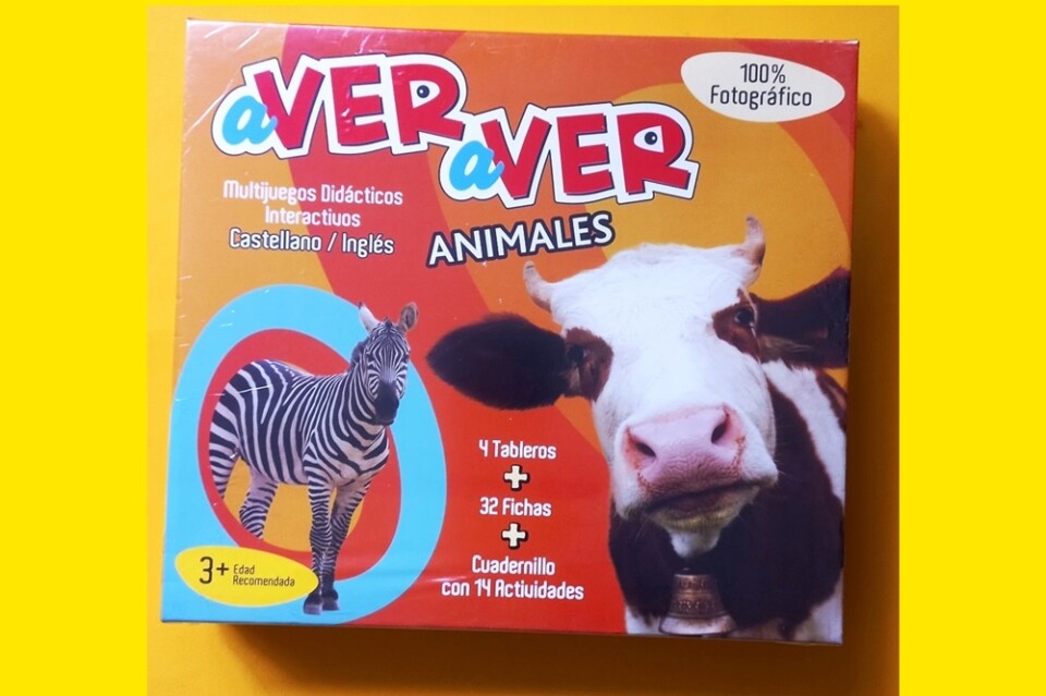 Contiene: 4 tableros de juego con 8 fotografías de animales cada uno, en el dorso los nombres de los animales en inglés, 32 fichas con fotos, en su dorso los nombres de los animales en castellano, cuadernillo con actividades y bolsa de plástico reforzado.