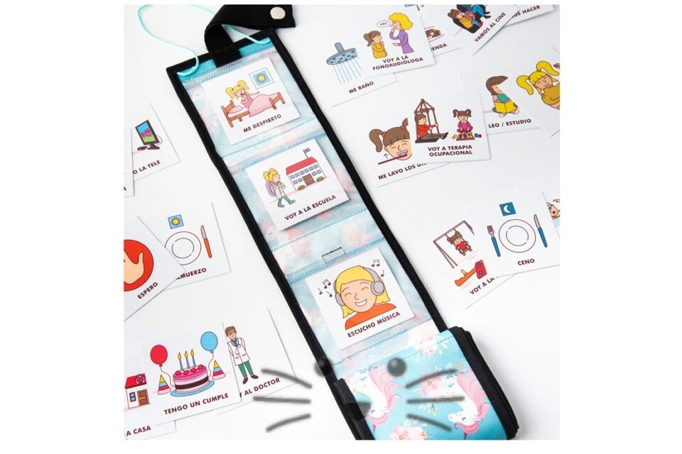 Agenda portátil plegable para anticipar las rutinas del día, insertando las imágenes o pictogramas en los bolsillos sin necesidad de velcro o imán. Medidas: Extendida 94 cm x 11 cm. 9 casilleros transparentes de 9 cm x 11 cm. Contiene 40 tarjetas laminadas frente y dorso de 7 x 7 cm