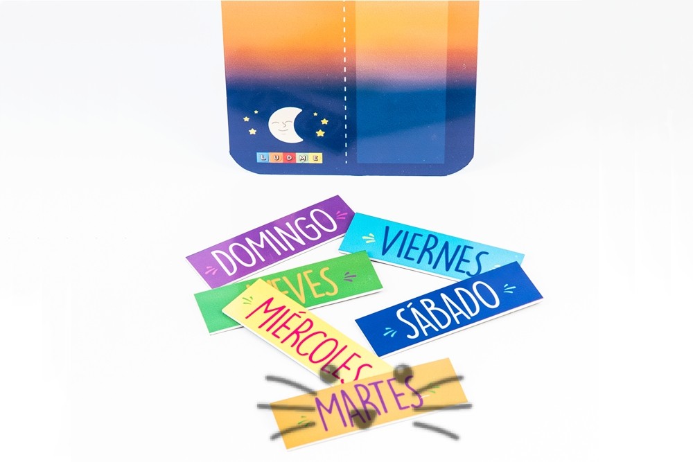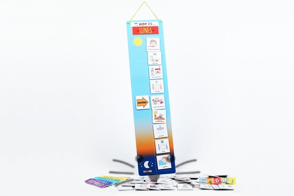 Agenda visual para utilizar con fichas imantadas. Incluye fichas con los 7 días de la semana. La placa es metálica revestida en vinilo, y las fichas poseen imán en la parte posterior para adherirse y retirarse fácilmente. Medidas del panel: 58 x 14 cm aprox. El imán recubre toda la parte posterior, evitando piezas pequeñas. Con soga para colgar. Este panel no incluye fichas de actividades o rutinas pero pueden adquirirse por separado.