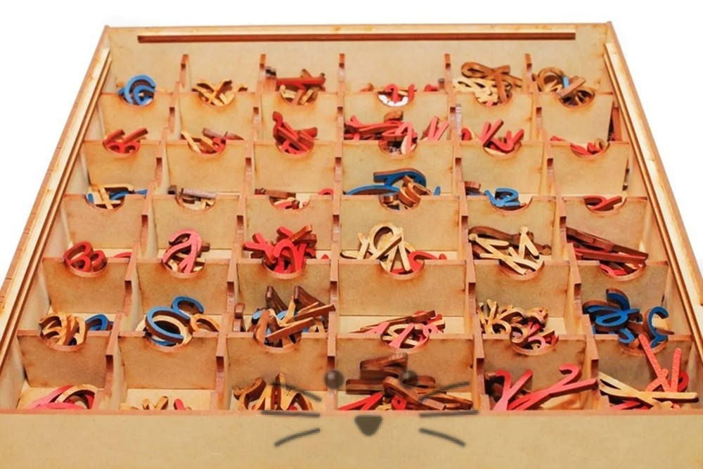 En un mismo producto, toda la simbología del español. Se presenta en caja de madera, con una tapa interior grabada con la posición de cada símbolo, para mantener el orden.