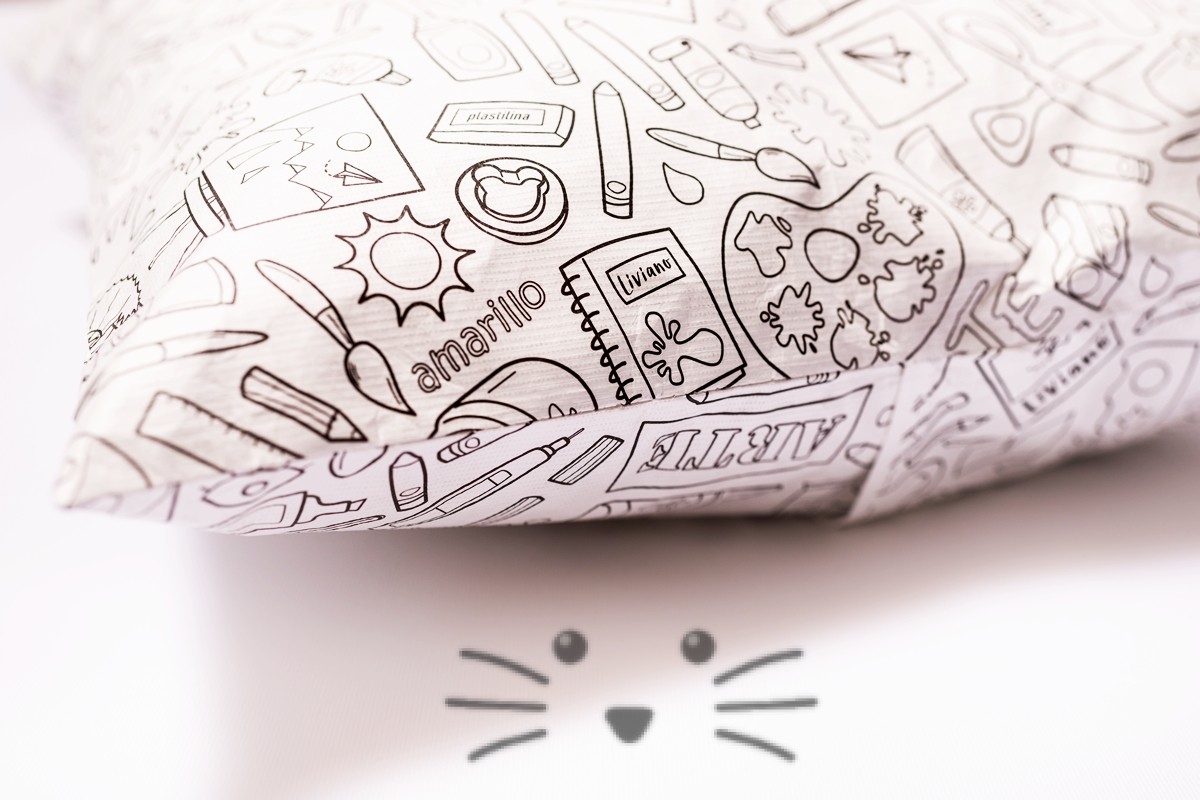 Almohadón con funda tela de papel para pintar, lavar y volver a colorear. Medidas: 40 x 40 cm. Relleno vellón siliconado en funda fiselina. Viene bolsa cristal con 6 marcadores. Edad Sugerida: 3 a 12 años