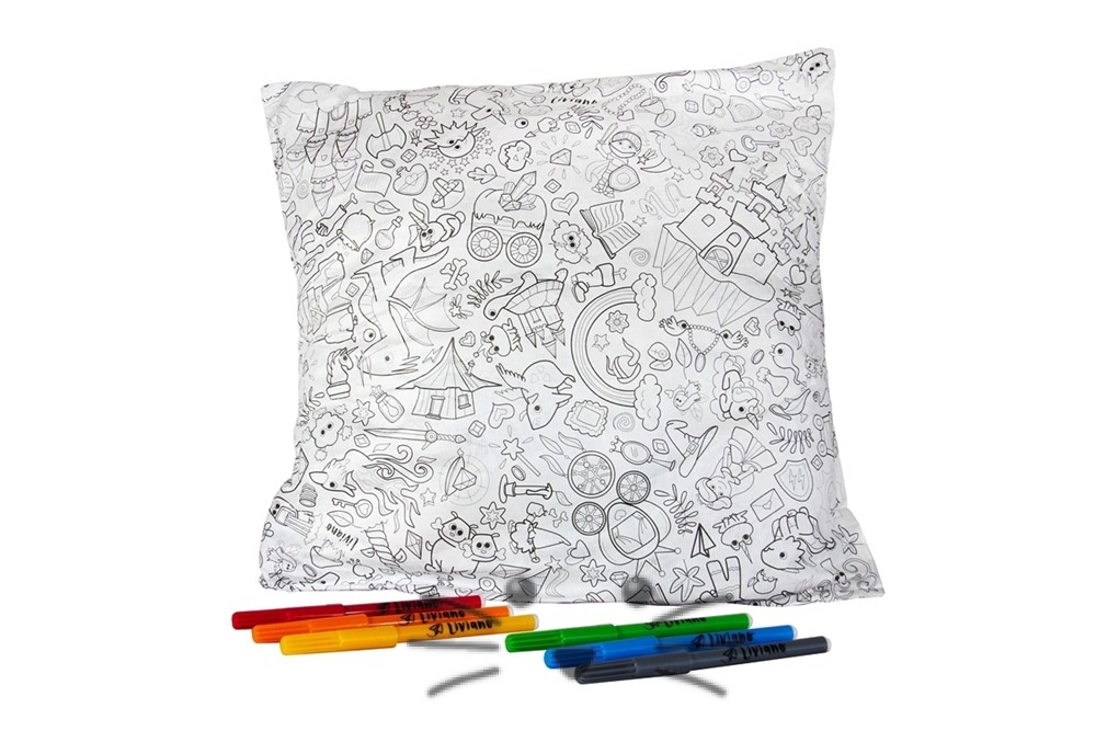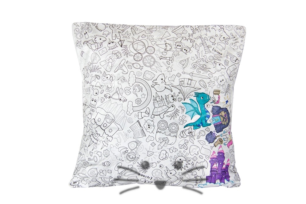 Almohadón con funda tela de papel para pintar, lavar y volver a colorear. Medidas: 40 x 40 cm. Relleno vellón siliconado en funda fiselina. Viene bolsa cristal con 6 marcadores. Edad Sugerida: 3 a 12 años