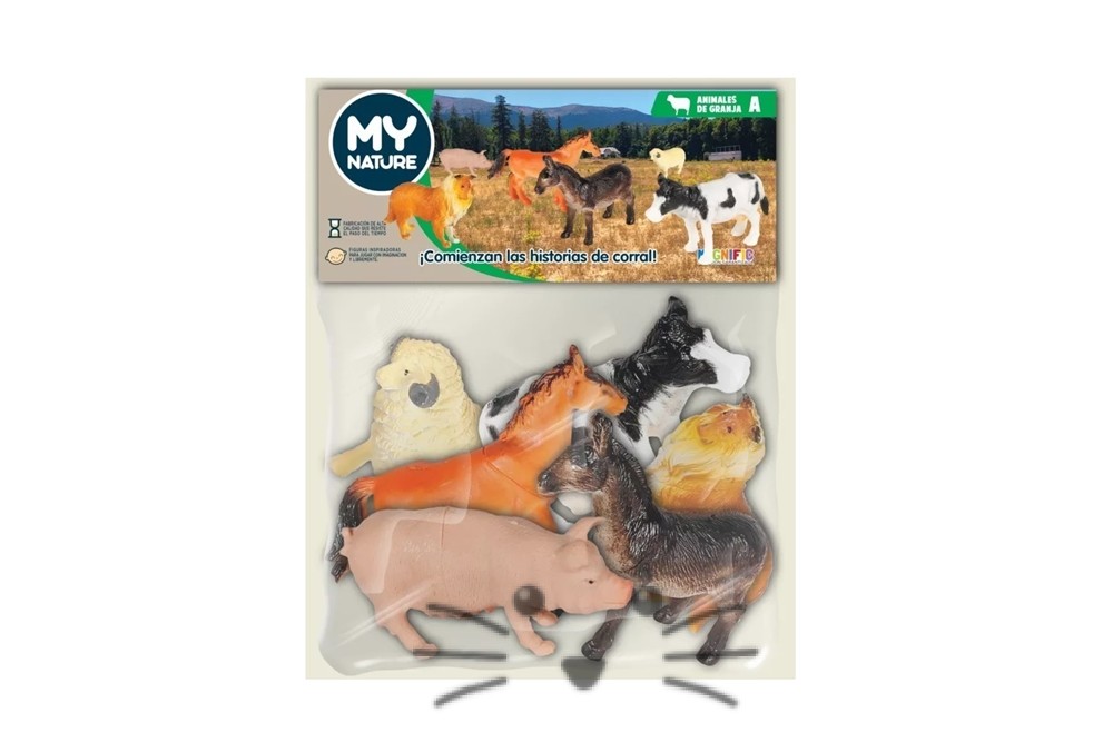 Set de figuras de animales de plástico. Incluye: caballo, oveja, perro, cerdo, burro y vaca. Modelo: Magnific My Nature Granja A