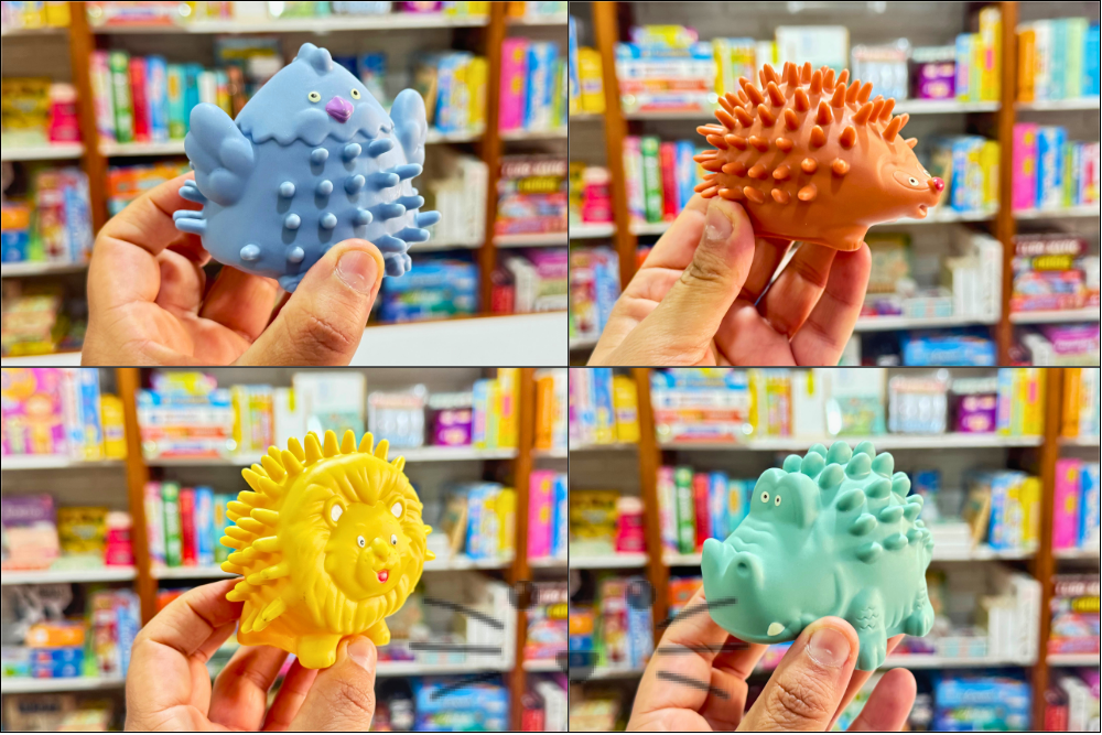 📦 Incluye: 4 animales de goma con diferentes texturas y formas.