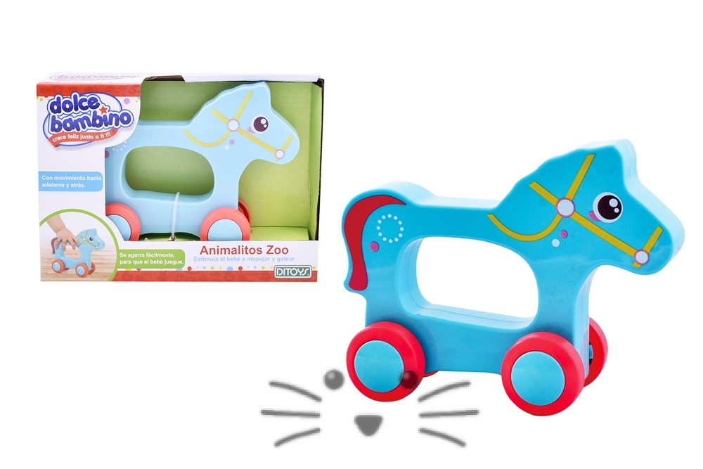 Caballito con movimiento hacia atrás y adelante. Se agarra fácilmente para que el bebé juegue con él. Estimula al bebé a empujar y gatear.
