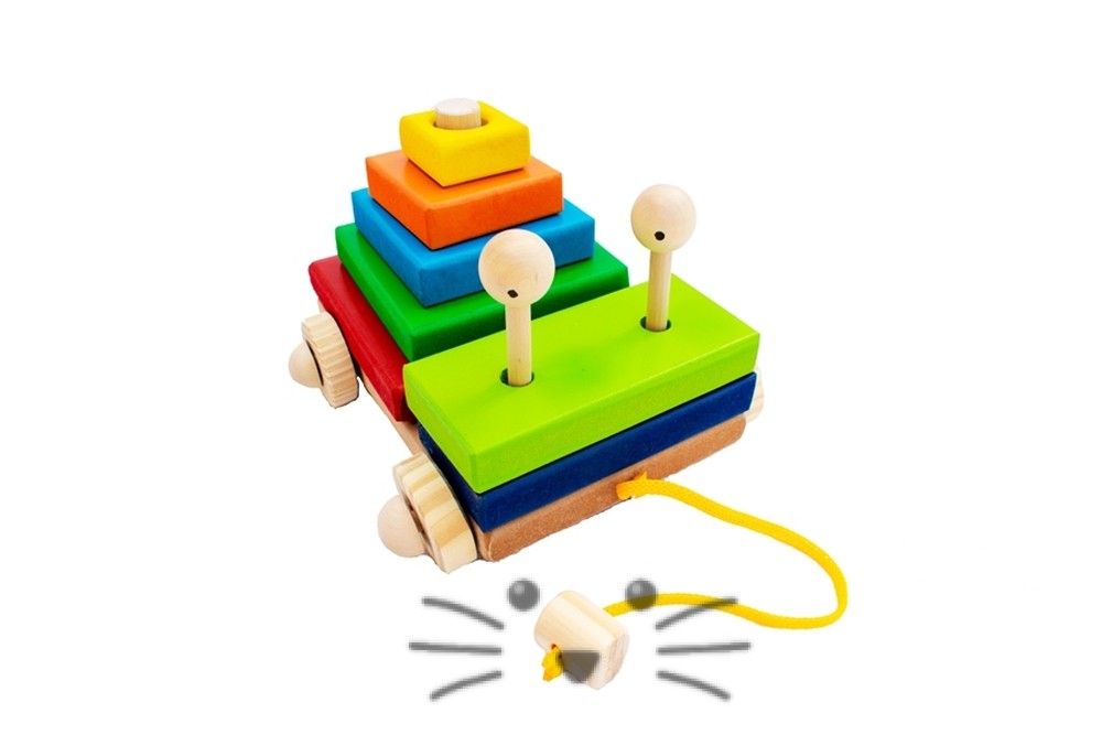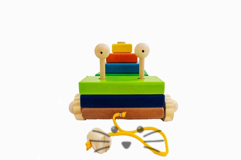 Bichito de arrastre de madera con piezas para encastrar. Muchas actividades en un solo juego: Arrastre. Ensarte. Seriación. Color. Mide 18 cm x 17 cm la base y 12 cm de alto. La torre tiene 5 cuadrados, el más grande es de 12 x 12 cm. Incluye también 2 rectángulos y los ojitos. Edad Sugerida: de 1 a 3 años