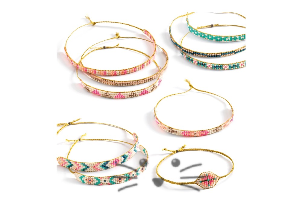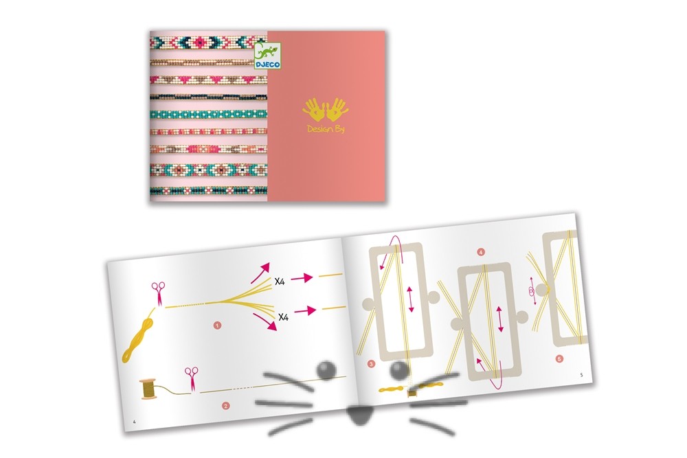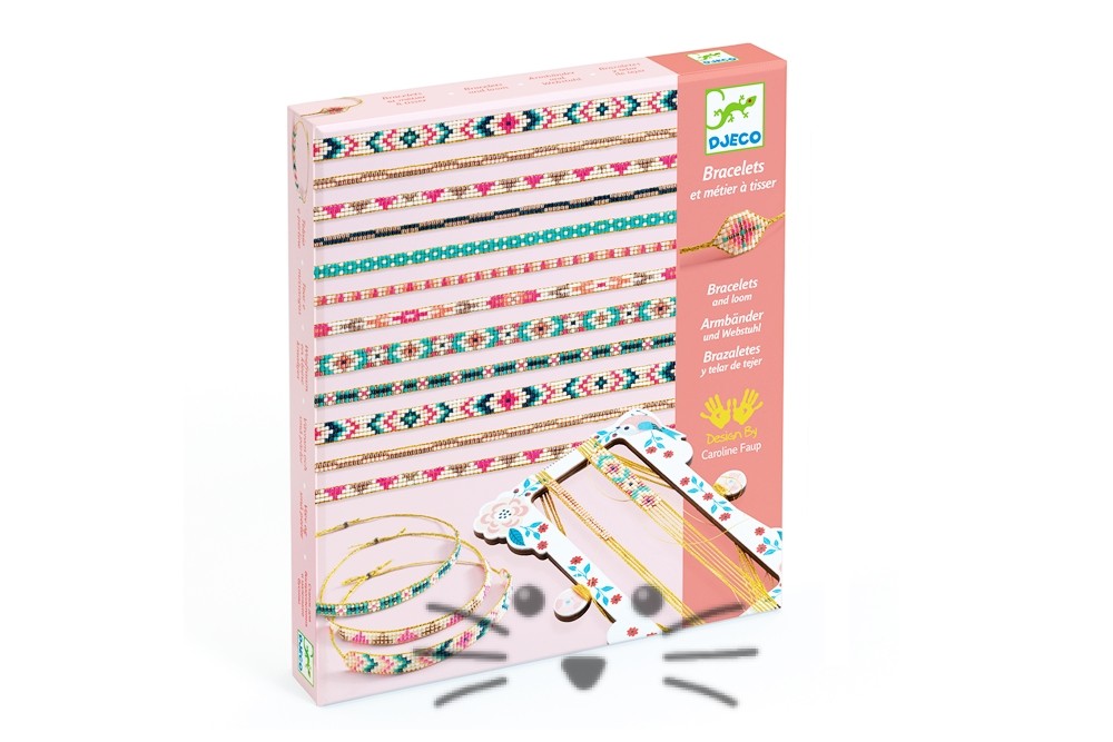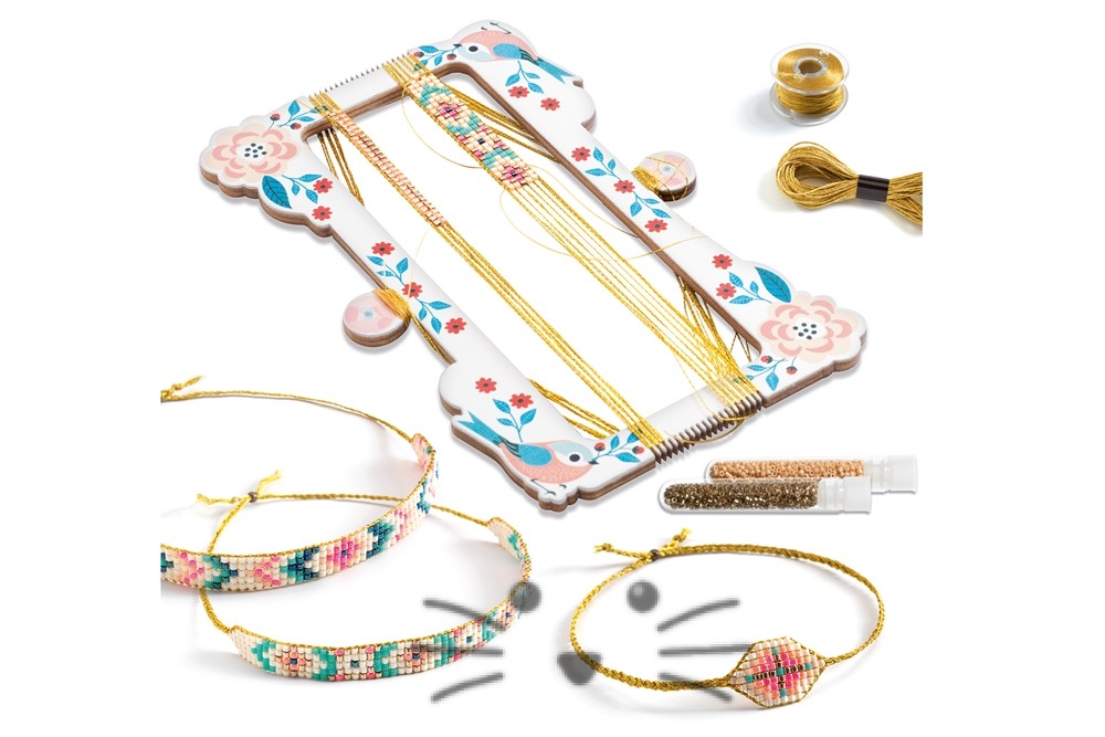 Un cofre de cuentas para hacer bonitas pulseras usando un telar. Siguiendo los pasos y modelos del folleto, el niño teje las pequeñas cuentas de colores en el telar para crear una decena de pulseras para llevar o para regalar. Contiene: 8 tubos de cuentas (8 colores), 1 telar bien ilustrado que se sujeta con una mano, 2 carretes de hilo dorado y 1 folleto explicativo paso a paso (se proponen 10 modelos de pulseras). Edad Sugerida: a partir de 9 años en adelante.