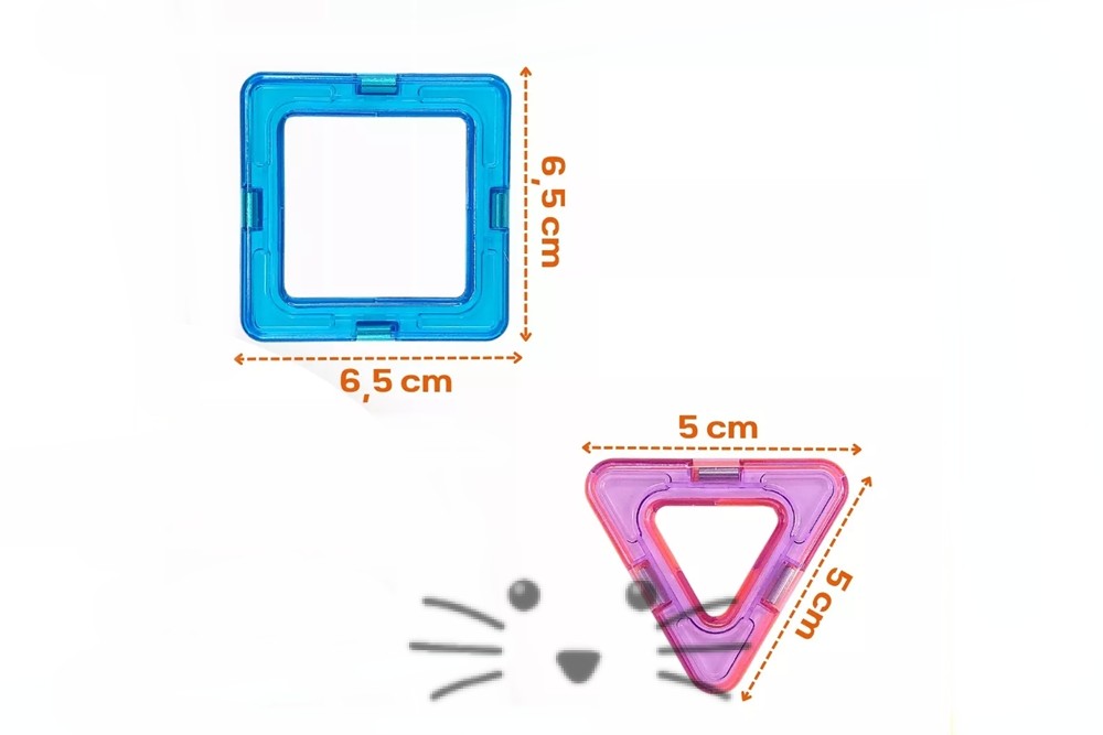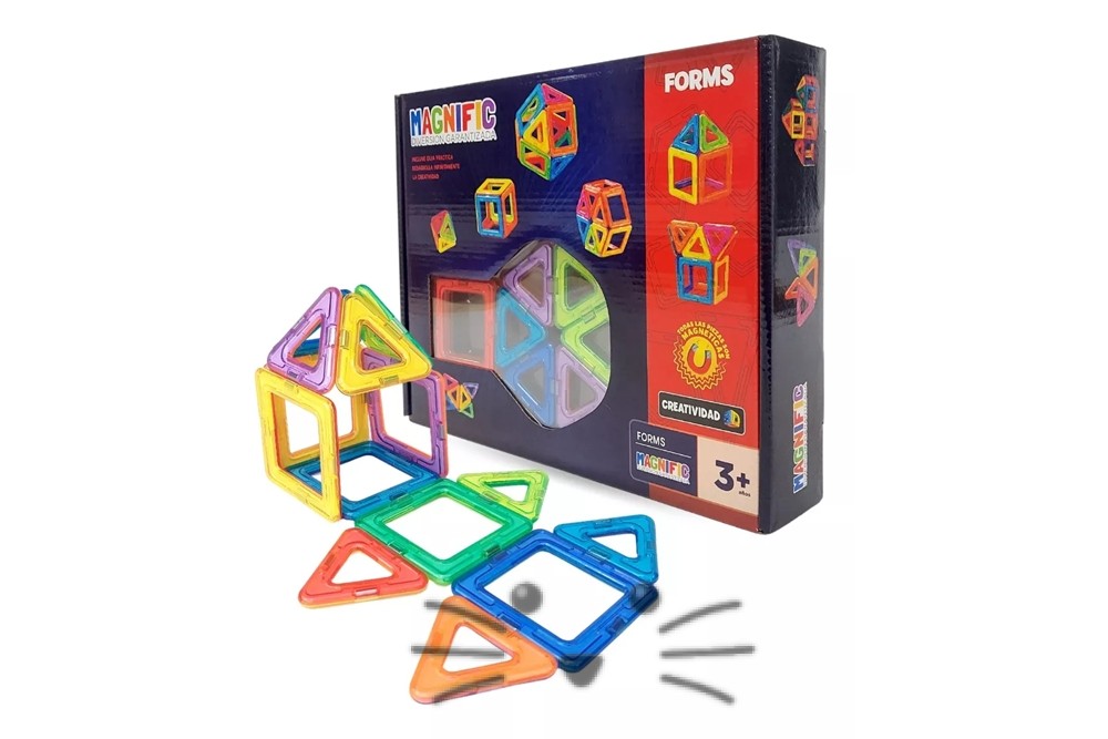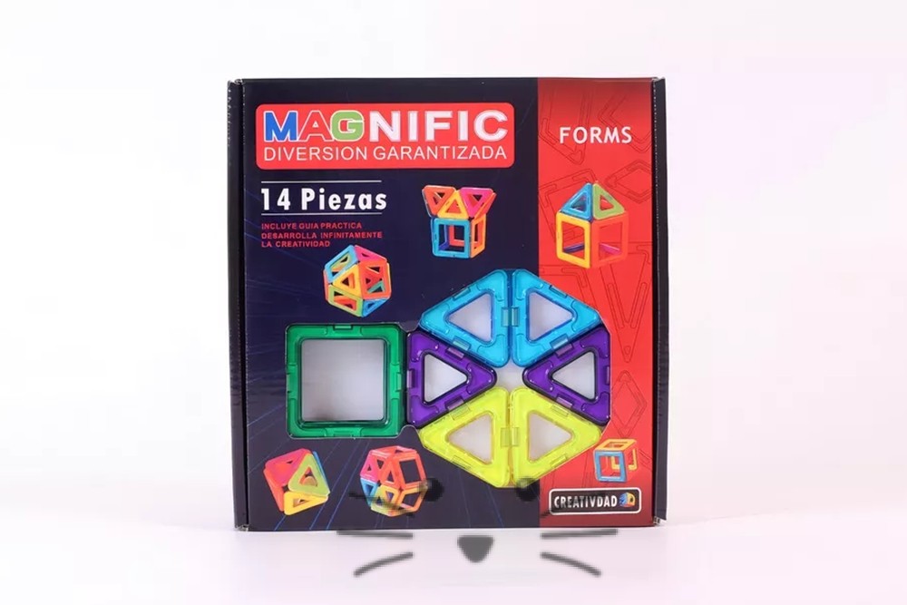 Set de 14 piezas magnéticas para armar diversas construcciones. Estimula el pensamiento constructivo, espacial y abstracto. Favorece la creatividad. Ayuda a ejercitar la habilidad manual. Experimenta la fuerza del magnetismo. Construye libremente. Incluye: 8 Triángulos 5 cm de base + 6 cuadrados de 6,5 cm de lado. Edad Sugerida: a partir de 3 años en adelante.