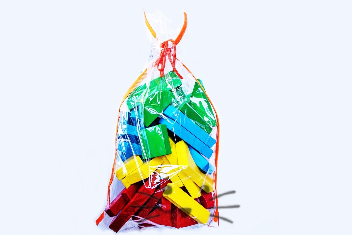 Juego de Construcción libre. Favorece la imaginación, la motricidad, la creatividad, la paciencia. Se puede jugar solo o con amigos. Contiene 60 bloques de madera de diferentes formas geométricas en 4 colores diferentes, las piezas vienen en varias medidas. Medidas bolsa: 40 cm de largo x 16 cm de ancho. Edad Sugerida: de 2 a 5 años.