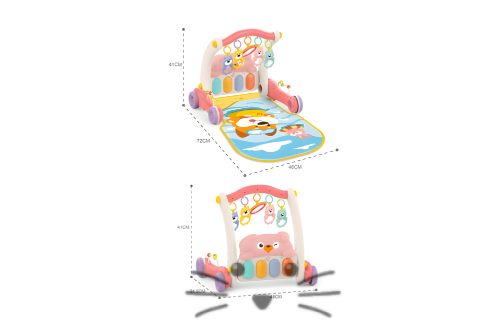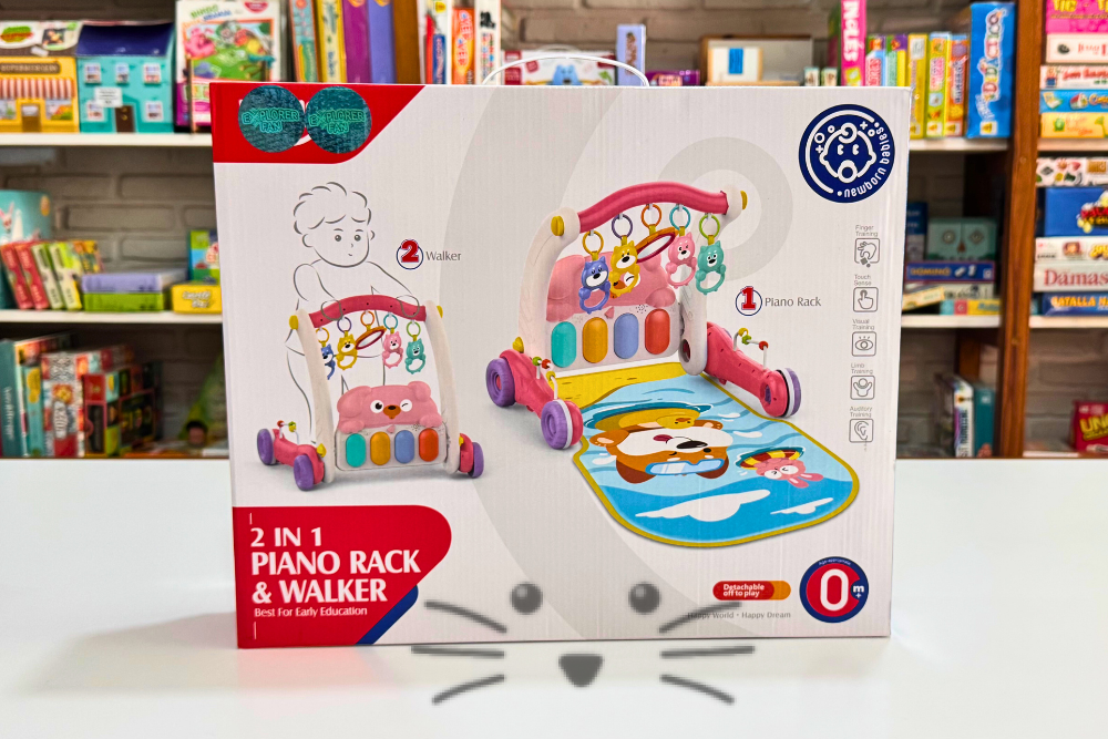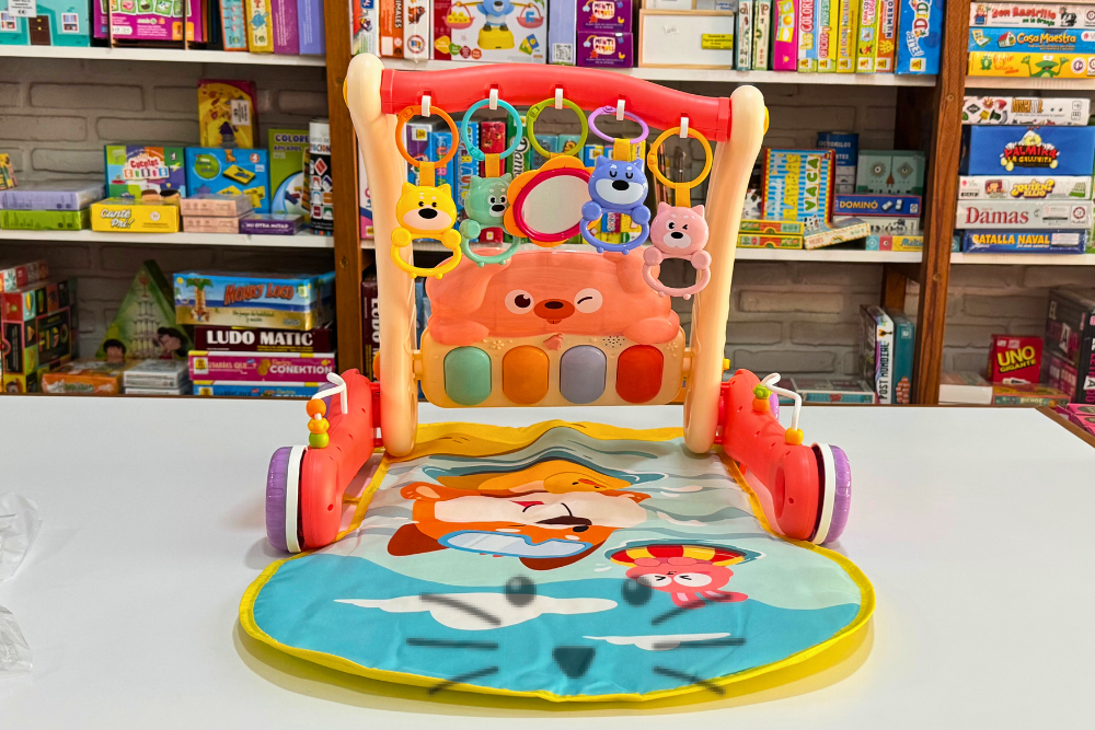 Este tapete de juego incluye un caminador para bebés, ofreciendo un espacio completo para el juego y el desarrollo. Los bebés pueden disfrutar tanto del tiempo boca abajo como de estar sentados mientras exploran y juegan. Equipado con teclas de piano grandes que reproduce luz y sonido. Los sonajeros integrados proporcionan entretenimiento adicional, ayudando a los bebés a desarrollar sus habilidades motoras finas mientras juegan y exploran. Este juego ofrece una variedad de actividades que estimulan los sentidos del bebé, incluyendo el tacto, la vista y el oído. Está fabricado en plástico resistente y acolchado suave, con juguetes colgantes. Requiere pilas no incluidas.