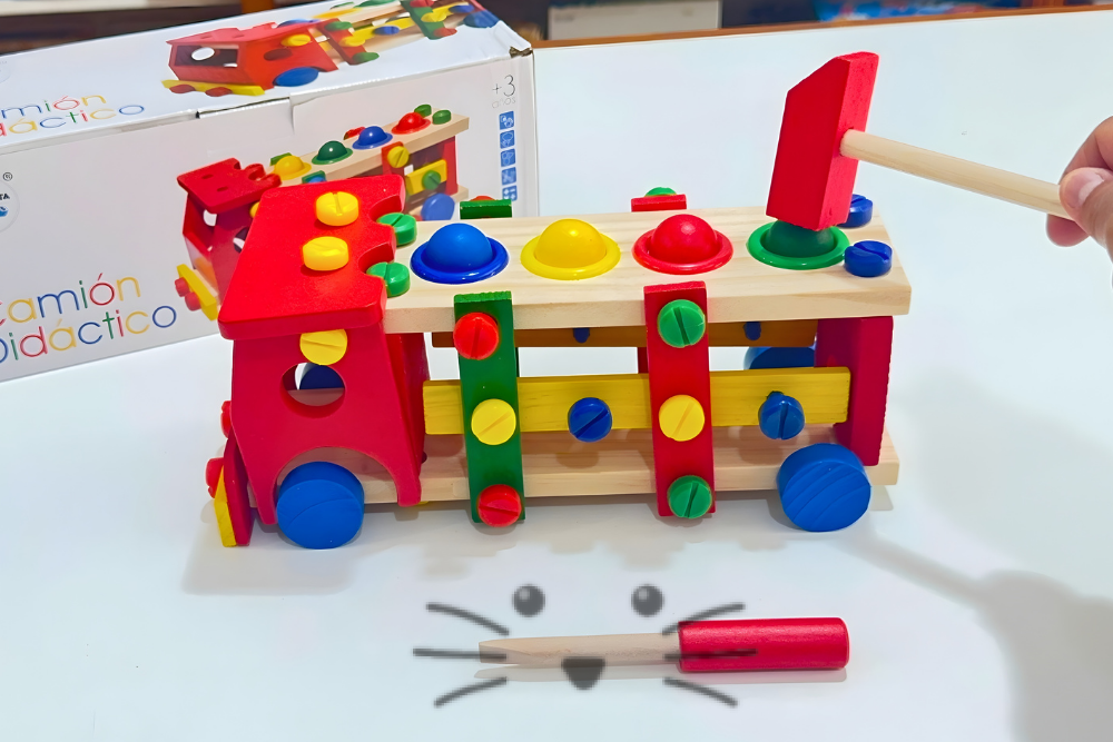 Incluye tornillos grandes, herramientas y bolitas de colores, permitiendo múltiples formas de juego: atornillar, golpear, encastrar y construir.