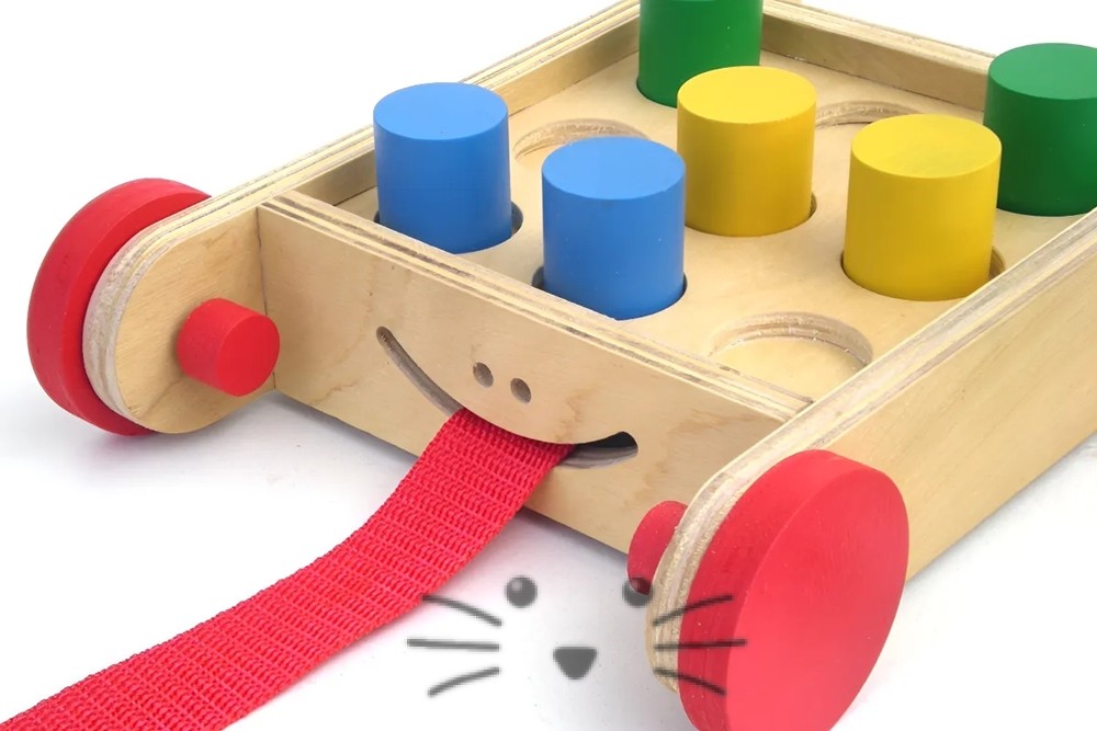 Juego de arrastre que transporta bloques de madera, estos se encastran en el piso del carrito que tiene bajo relieve incentivando la motricidad fina, también se puede jugar al tateti o a apilarlos haciendo equilibrio. Fabricado en madera. Medidas: 25 cm de ancho x 10 cm de alto y 30 cm de largo. Con cuerda. Edad Sugerida: a partir de 1 año en adelante.