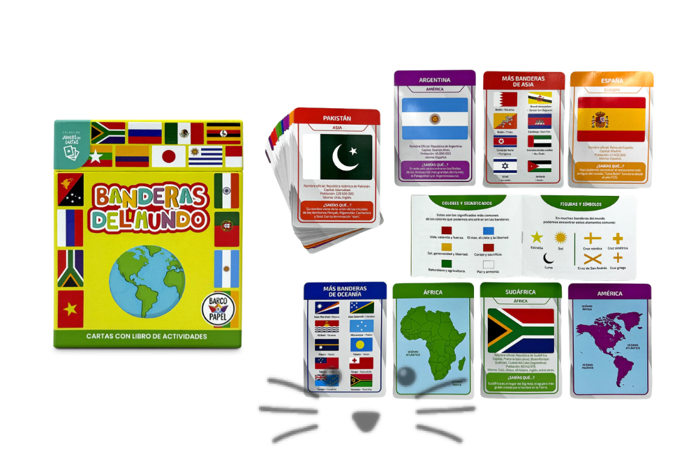 Este mazo de cartas invita a los chicos a descubrir la diversidad de países y continentes mientras aprenden sobre geografía y cultura. Cada carta presenta una bandera con información básica del país, datos curiosos y referencias sobre su ubicación. Una manera divertida y educativa de explorar el mundo, ideal para casa o la escuela. Incluye un libro de actividades exclusivo para seguir aprendiendo jugando.