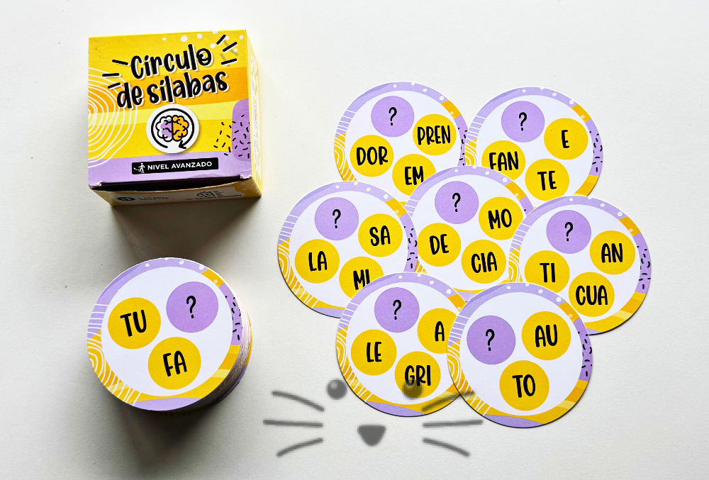 El objetivo del juego es adivinar la palabra ordenando todas las sílabas de la tarjeta, sin repetir ninguna sílaba que no esté repita en la tarjeta, ni dejando ninguna sílaba sin usar, teniendo en cuenta que la sílaba que está marcada en color fucsia será el principio de la palabra. Contiene 100 tarjetas con distintos niveles de dificultad que van aumentando según la cantidad de sílabas: 25 tarjetas de palabras de 3 sílabas, 25 tarjetas de palabras de 4 sílabas, 25 tarjetas de 5 sílabas y 25 tarjetas de 6 sílabas. Áreas a estimular: Lenguaje, velocidad de procesamiento, atención, flexibilidad cognitiva. Medidas: 9 cm x 9 cm x 4 cm. Edad Sugerida: a partir de 10 años en adelante.