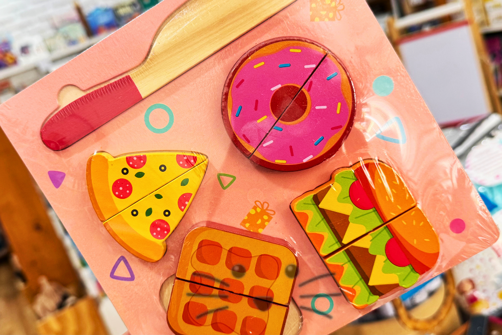Un clásico del juego simbólico que nunca pasa de moda. El set incluye una tabla, un cuchillo de madera y distintos alimentos unidos por velcro que se pueden “cortar” y volver a unir, una y otra vez. Favorece el desarrollo de la coordinación mano-ojo, la motricidad fina y el lenguaje, al mismo tiempo que estimula la creatividad y el juego de roles. Ideal para que los niños imiten situaciones cotidianas, como cocinar o preparar la comida.
