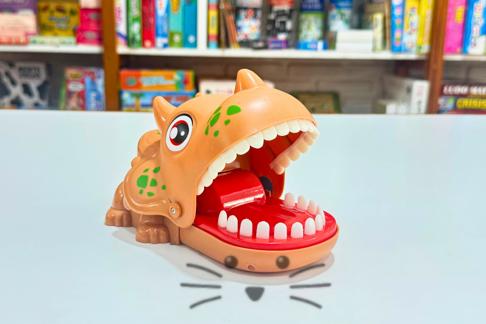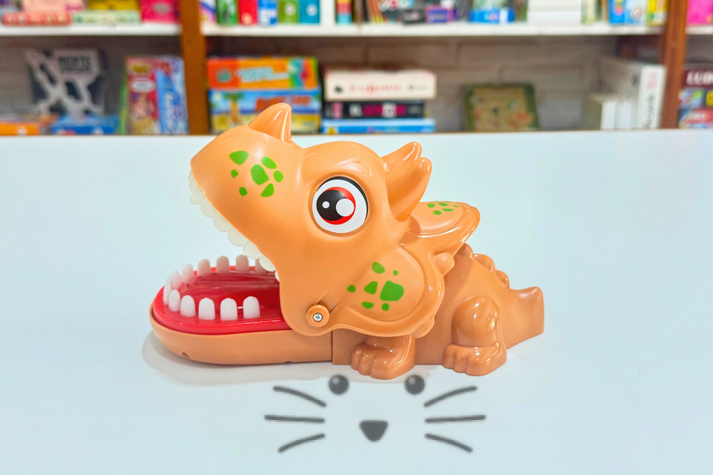 El Dinosaurio Mordelón desafía a los jugadores a presionar sus dientes sin saber cuál hará que cierre la boca de golpe. Ideal para compartir en familia o con amigos, es un juego que combina tensión, sorpresa y mucha diversión.
