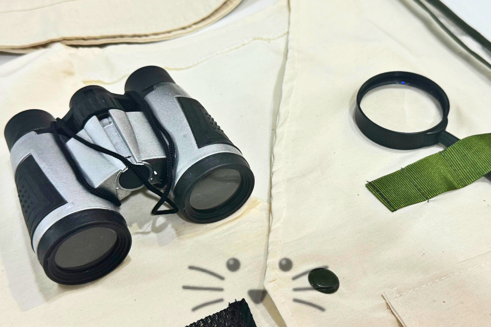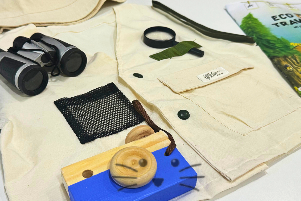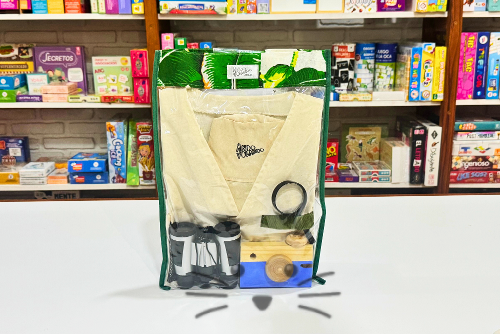 Contiene: Chaleco, gorro, binoculares, lupa, cámara de fotos y libro de actividades. Presentación: Bolsa de nylon reutilizable con manija. Medidas chaleco: . Medidas bolso: 28 cm x 35 cm. Edad Sugerida: a partir de 4 años.