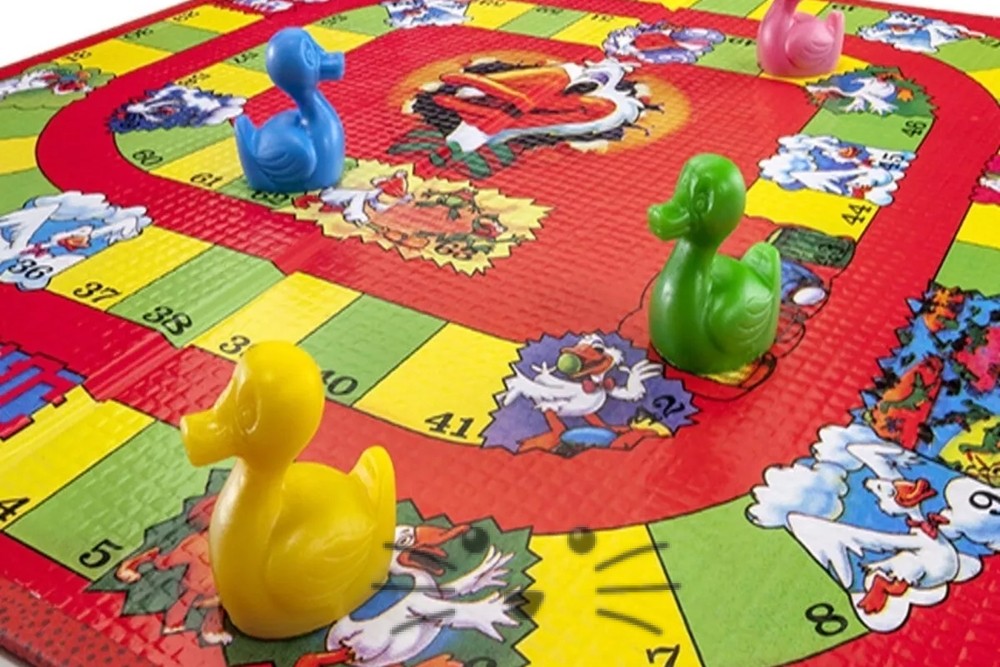Tradicional juego de la oca. Los jugadores deben tirar los dados en su turno y avanzar con su Oca, tantas casillas como números haya sacado. Siempre que caiga en una casilla que tenga alguna figura deberá consultar la tabla de PREMIOS Y PRENDAS y hacer lo que allí está indicado. Será el ganador el primer jugador que llegue a la casilla 63, pero deberá llegar con el número justo para espantar las ranas. Si al tirar los dados se pasa la misma, retrocederá tantos puntos como los que se haya pasado. Contiene: 1 tablero, 4 ocas, 2 dados, 1 cubilete y 1 reglamento. Para 2 a 4 jugadores a partir de 4 años.