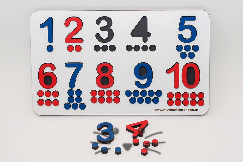 Material didáctico para desarrollar y ejercitar la motricidad y el aprendizaje de números, favorece el reconocimiento de patrones, colores y el conteo. Consiste en números encastrables del 1 al 10. Con fichas para asociar número/cantidad. Medidas: Tablero 27 x 16 cm. Números 4 cm. Material: MDF Fibrofácil de 3 mm pintado. Edad Sugerida: a partir de 3 años.