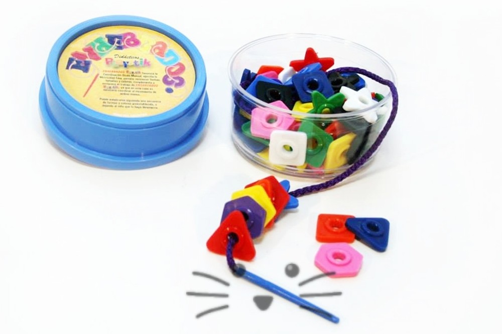 Enhebrado de fichas surtidas confeccionado en plástico ultra resistente. Se trata de un juego de fichas atributivas de diversas formas y colores para que los niños realicen diferentes combinaciones. Un excelente material manipulativo que desarrolla la percepción visual, el reconocimiento de las formas y los colores y la percepción táctil. Dimensiones pote: 9 cm de diámetro x 11 cm de altura aprox. Incluye: 60 fichas, aguja y cordón. Edad sugerida: a partir de 3 años