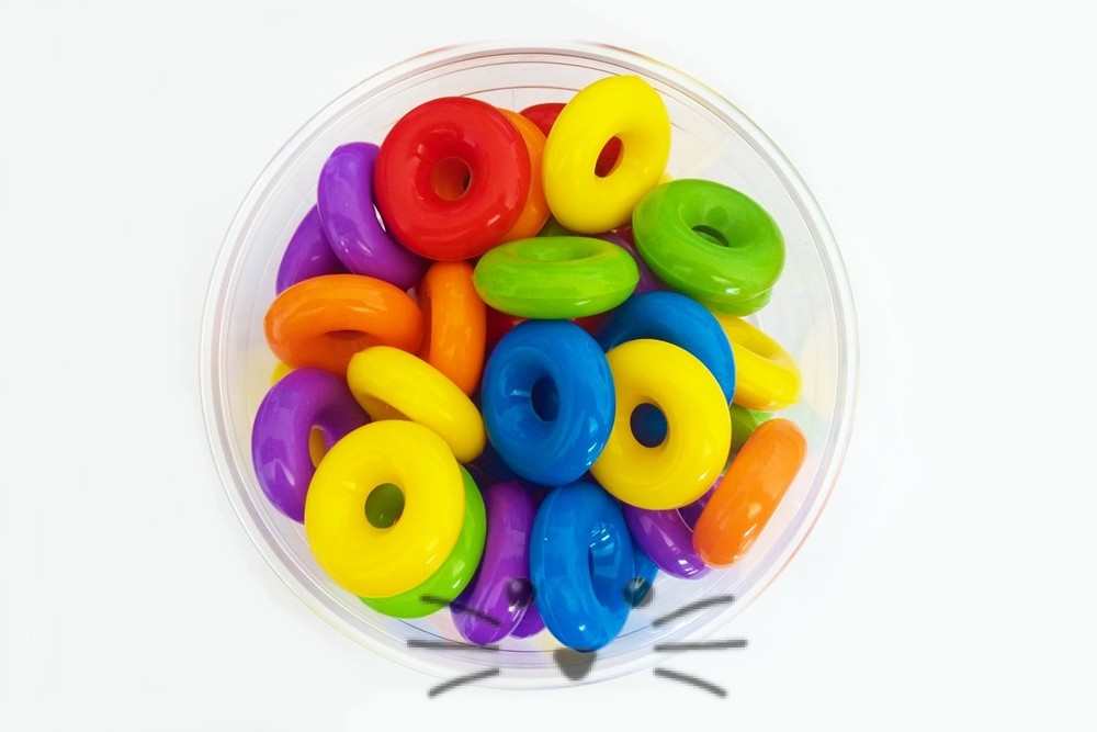 Confeccionado en plástico ultra resistente. Contiene 48 piezas de anillos de 30 mm de espesor, aguja y cordón. Dimensiones pote: 9 cm de diámetro x 11 cm de altura aprox.