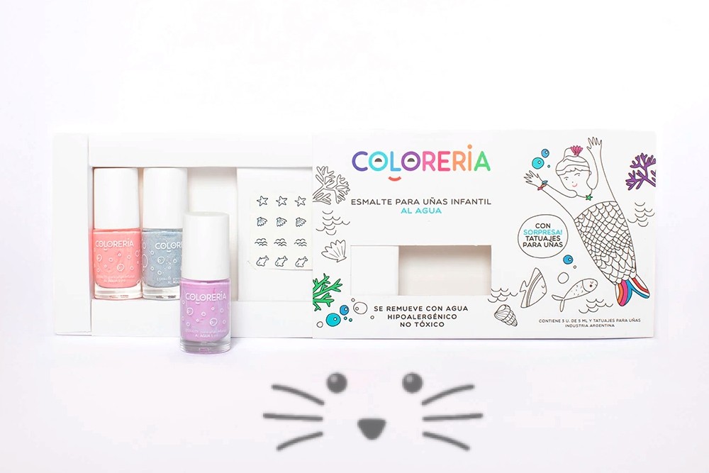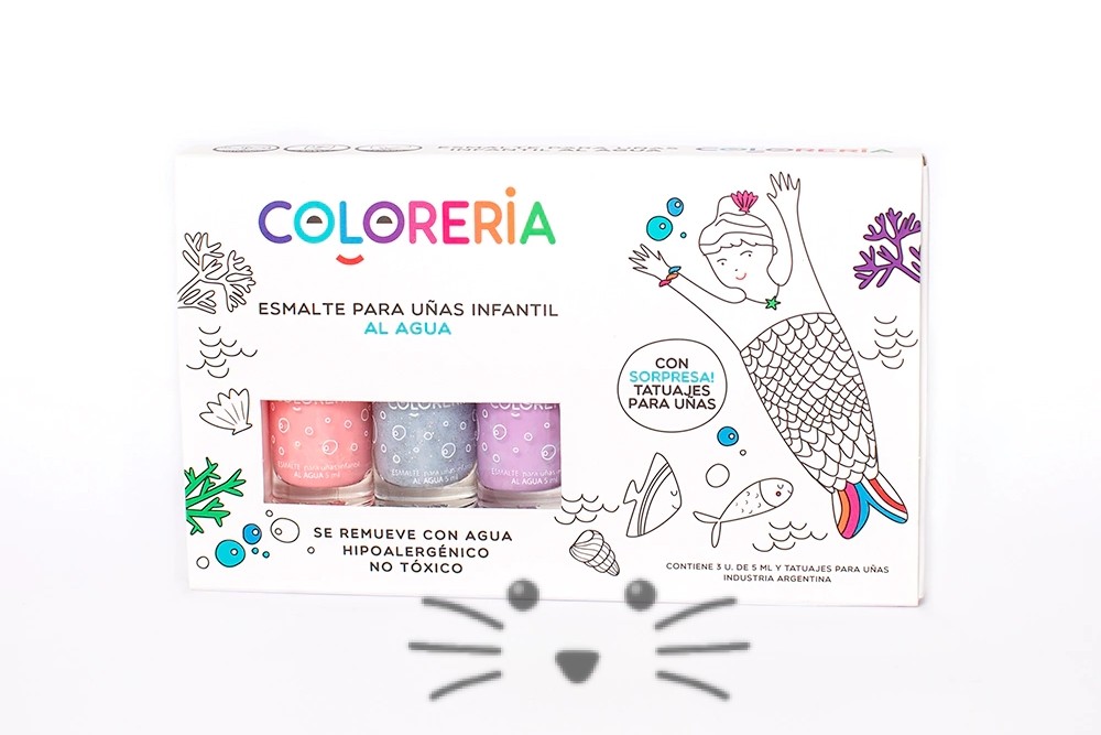 Contiene 3 esmaltes de 5 ml (Rosa, Lila y Glitter) y una plancha de 16 tatuajes para decorar las uñas. Son AL AGUA, es decir que se remueven con agua tibia y jabón con ayuda de un algodón o esponja, sin necesidad de usar quitaesmaltes ni acetona. Aprobados por ANMAT para niños a partir de 3 años. Son hipoalergénicos y no tóxicos. No fueron testeados en animales ni tienen ingredientes de origen animal.