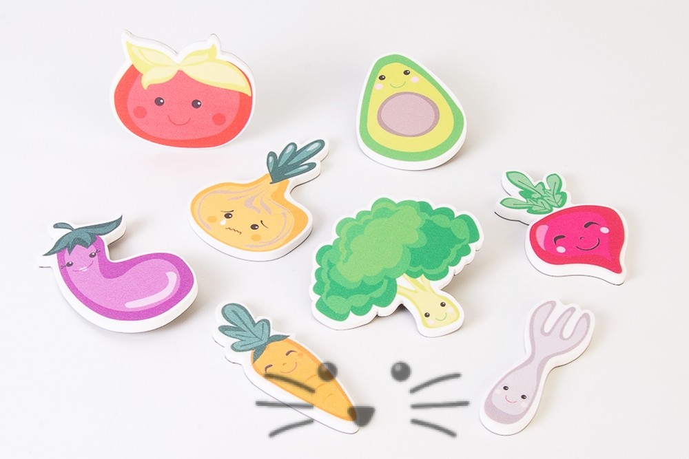 Juego imantado de alimentos para divertirse y aprender. Contiene 8 figuras imantadas fabricadas en goma eva de alta densidad de 6 mm de espesor. Medidas aproximadas: 6 x 5 cm