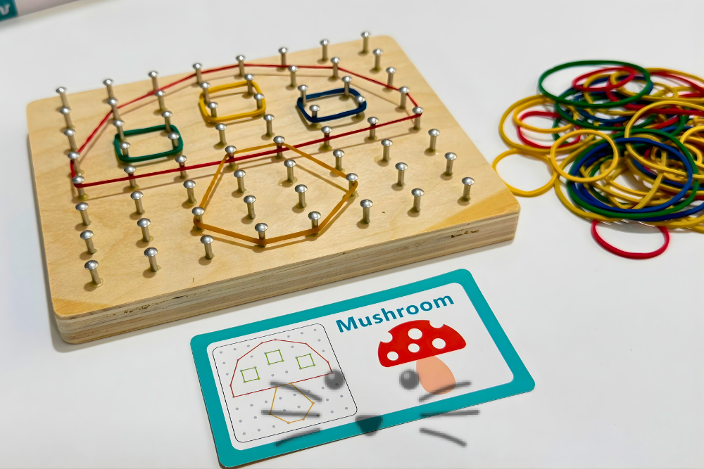 Un material didáctico que estimula la creatividad, el pensamiento lógico y la percepción espacial a través de la construcción de figuras con bandas elásticas. El geoplano permite reproducir modelos propuestos en tarjetas o crear diseños propios, trabajando formas geométricas, simetría y coordinación motriz de manera lúdica y desafiante.