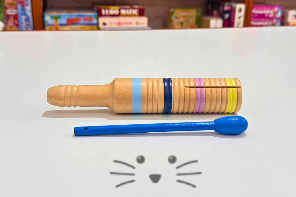 Un instrumento de percusión clásico, ideal para que los niños descubran el ritmo a través del raspado y la vibración. Se ejecuta raspando con un palillo o baqueta la superficie rugosa o ranurada con mayor o menor velocidad obteniendo así la emisión de diferentes sonidos. Material: madera resistente y pintura no tóxica.