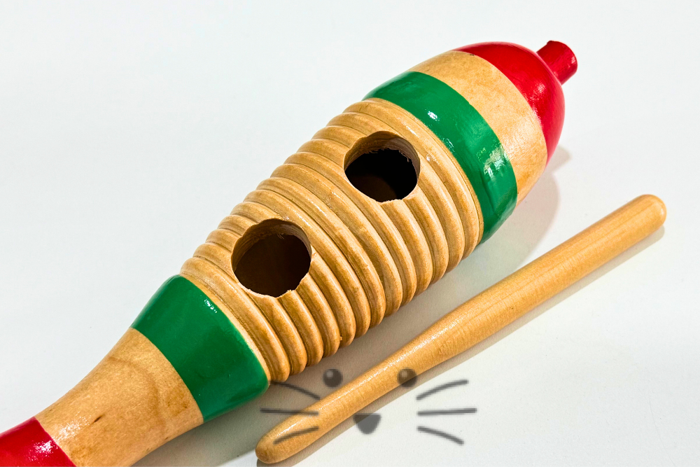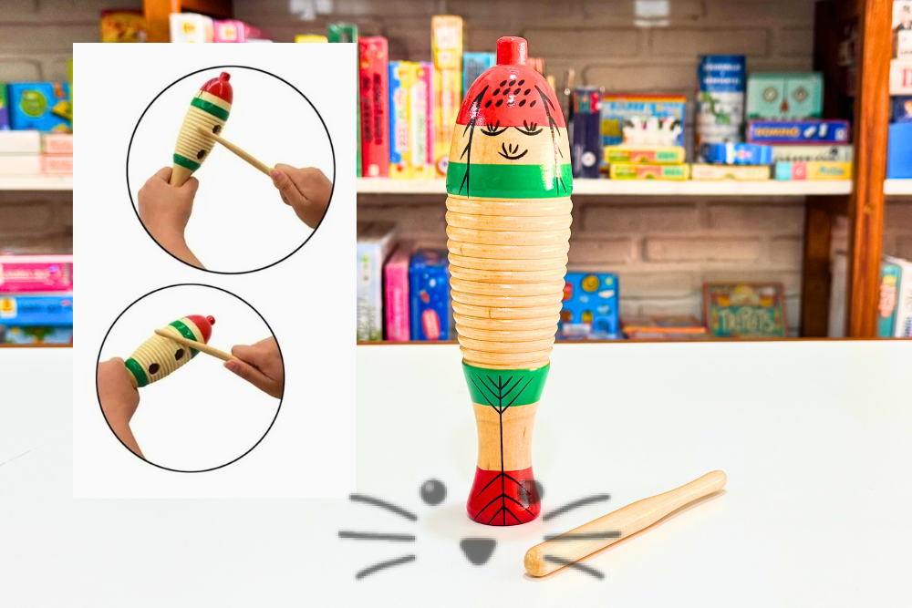 El güiro es un instrumento musical muy simple construido originalmente en el cuello de una calabaza gruesa. Este se ejecuta raspando con un palillo o baqueta la superficie rugosa o ranurada con mayor o menor velocidad obteniendo así la emisión de diferentes sonidos. Material: madera de primera calidad y resistente. Pintura no toxica. Medidas: 21 cm de largo x 6 cm de diámetro. Edad Sugerida: entre 4 y 6 años.