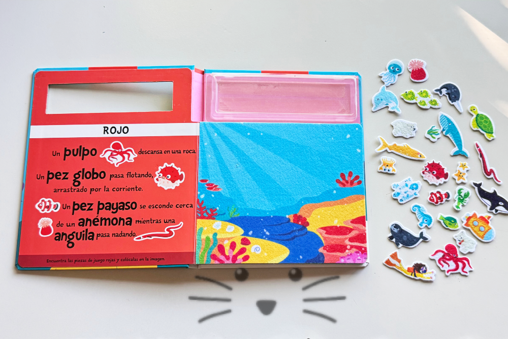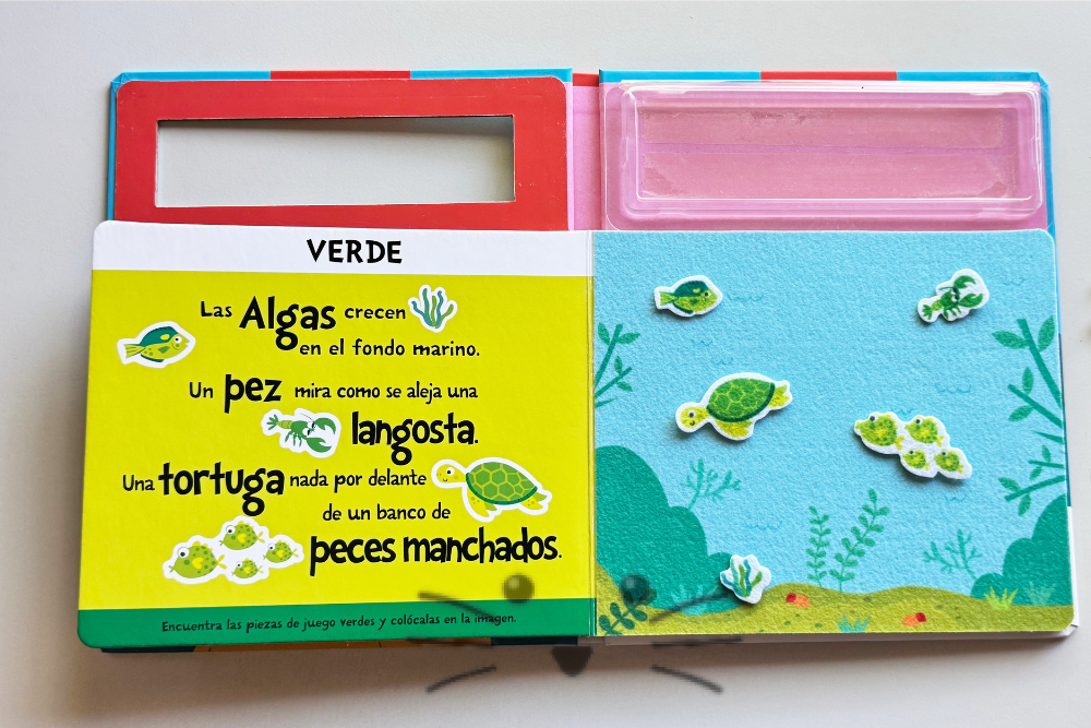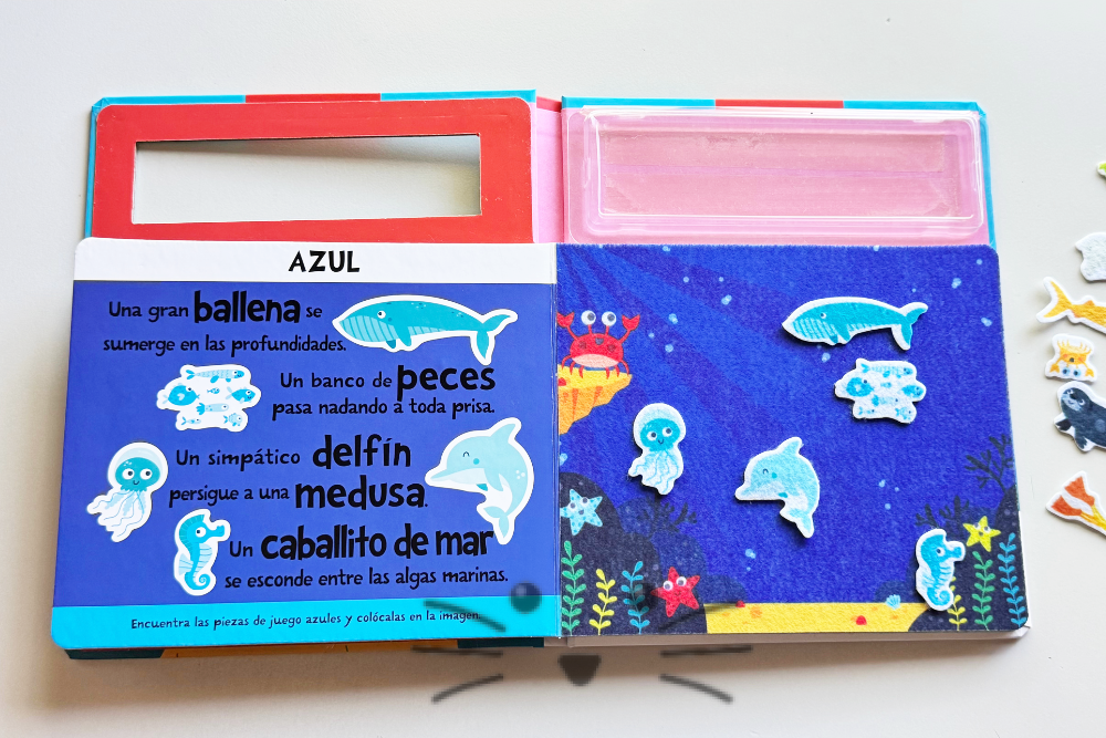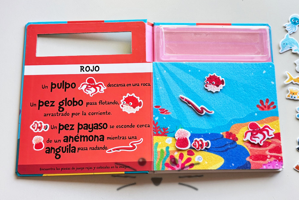 Los pequeños se divertirán completando cada una de las coloridas escenas, mientras colocan las suaves piezas de fieltro y aprenden los colores. Las piezas de fieltro se adhieren a las páginas y puedes utilizarlo una y otra vez. Tapa e interiores en cartón plastificado resistente. Contiene: 10 páginas a todo color, 28 piezas de fieltro y 5 escenas de juegos. Tamaño de 20 x 24 cm. Edad Sugerida: a partir de 3 años en adelante
