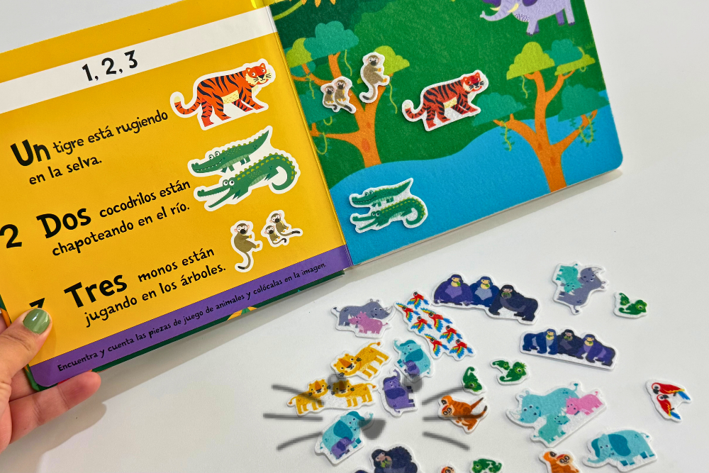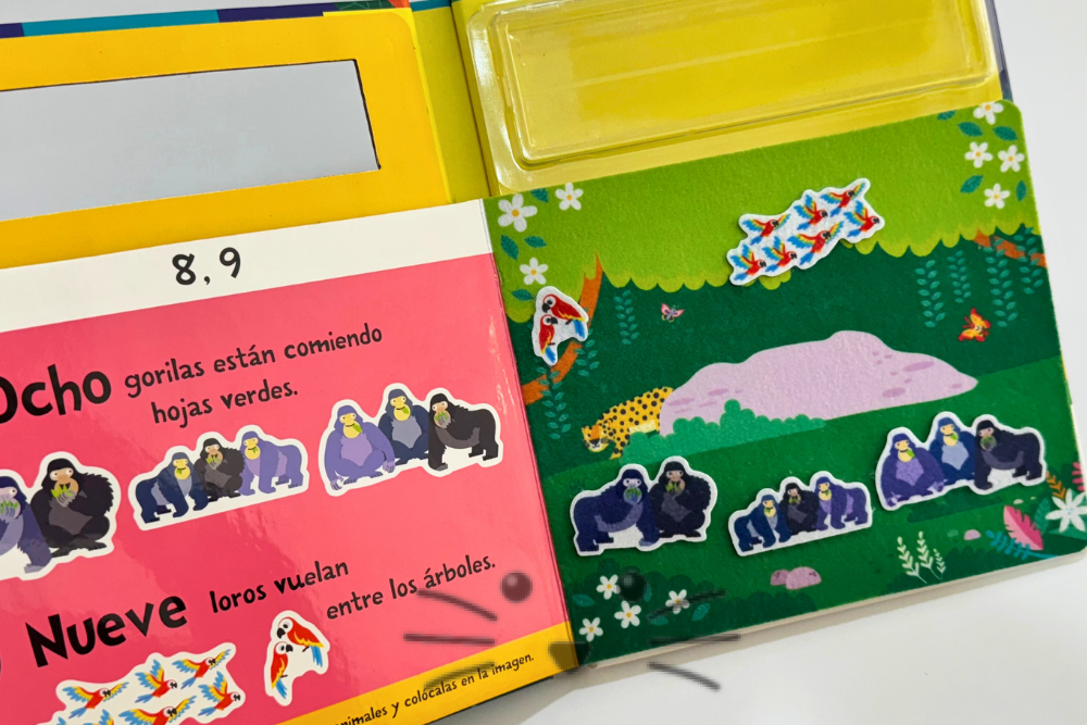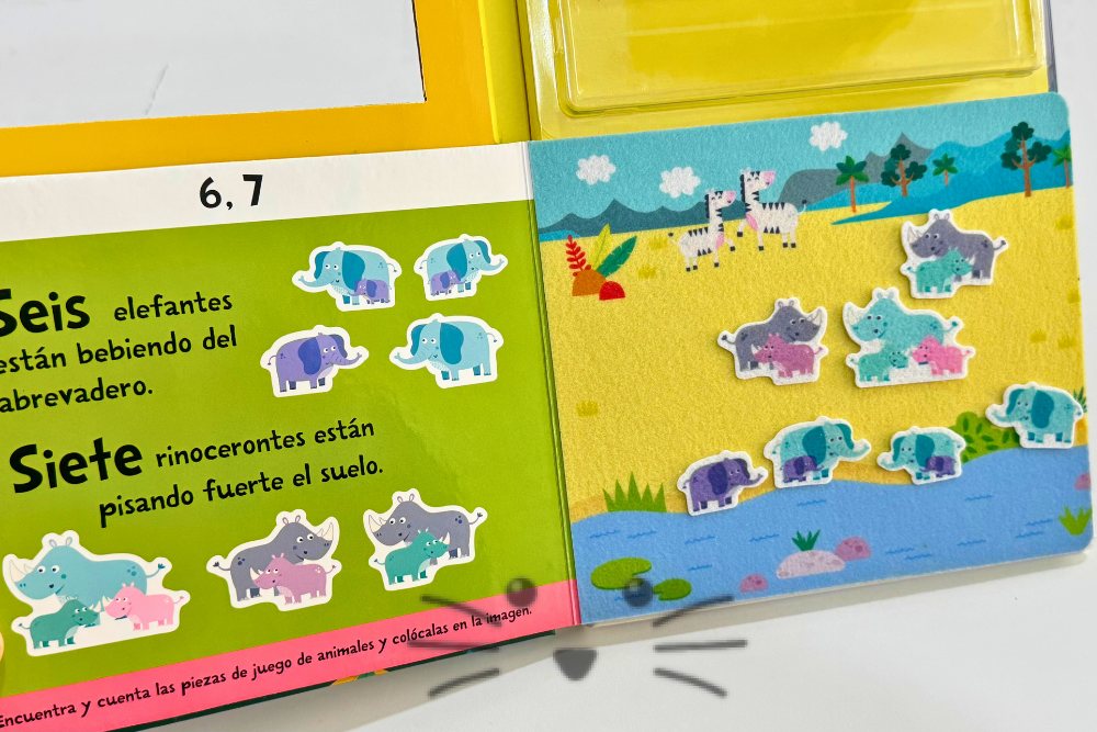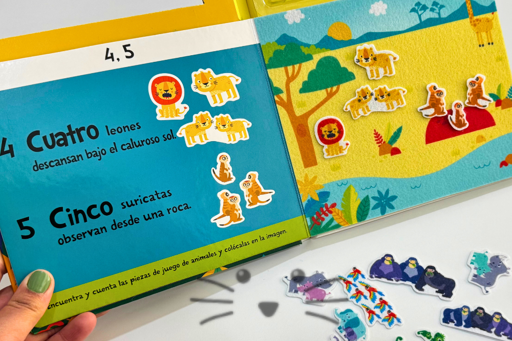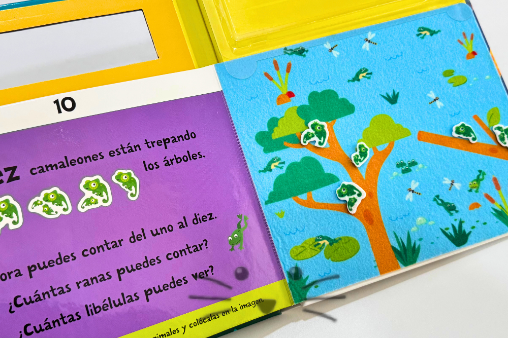 Los pequeños se divertirán completando cada una de las coloridas escenas, mientras colocan las suaves piezas de fieltro y aprenden a contar del 1 al 10. Las piezas de fieltro se adhieren a las páginas y puedes utilizarlo una y otra vez. Tapa e interiores en cartón plastificado resistente. Contiene: 10 páginas a todo color, 28 piezas de fieltro y 5 escenas de juegos. Tamaño de 20 x 24 cm. Edad Sugerida: a partir de 3 años en adelante