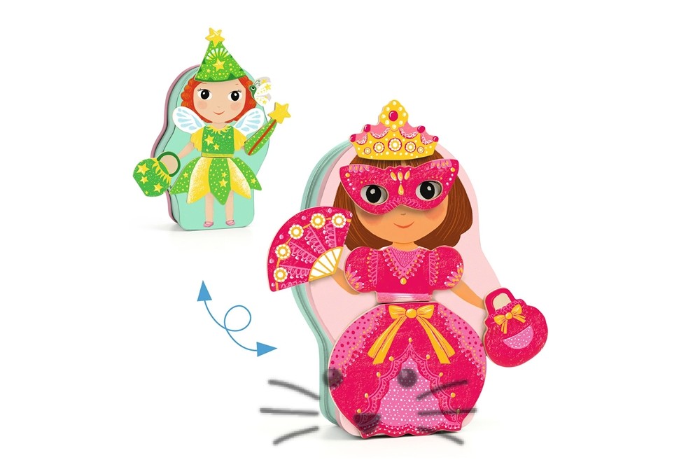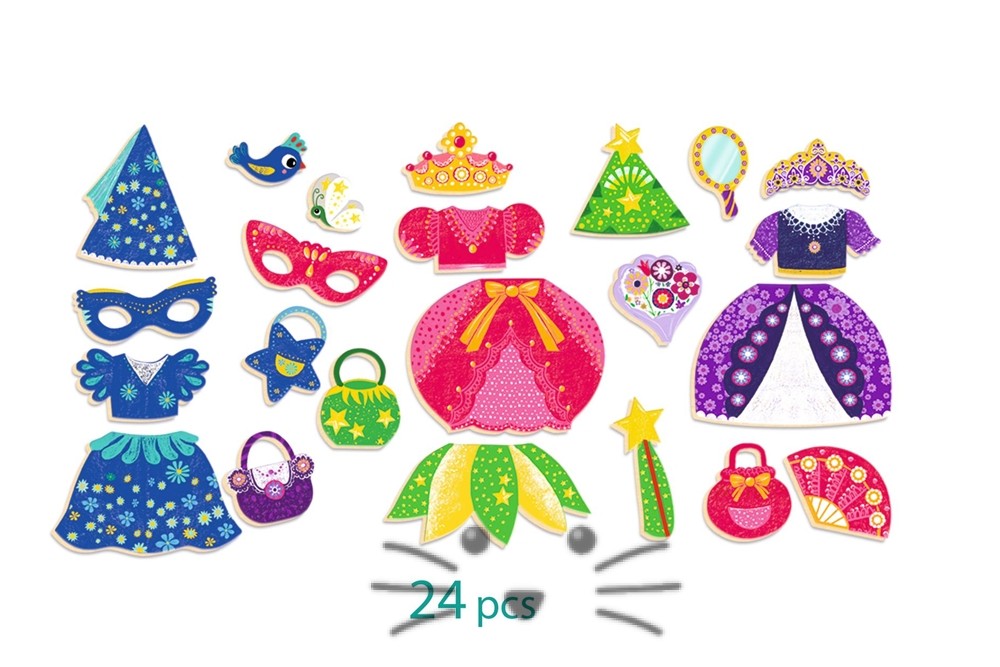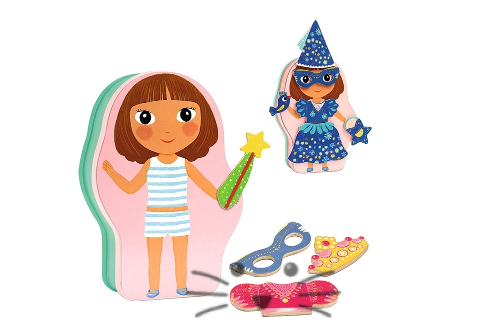 Una nueva forma de jugar con imanes. Una caja de metal con silueta en la que los niños colocan piezas magnéticas de madera para divertirse vistiendo a bellas hadas y princesas. Contenido: 1 caja de metal con forma de princesa y 24 piezas de madera magnéticas. Los dos lados de la caja están ilustrados para poder jugar en ambos. Ideal para viajes. Edad Sugerida: a partir de 3 años en adelante