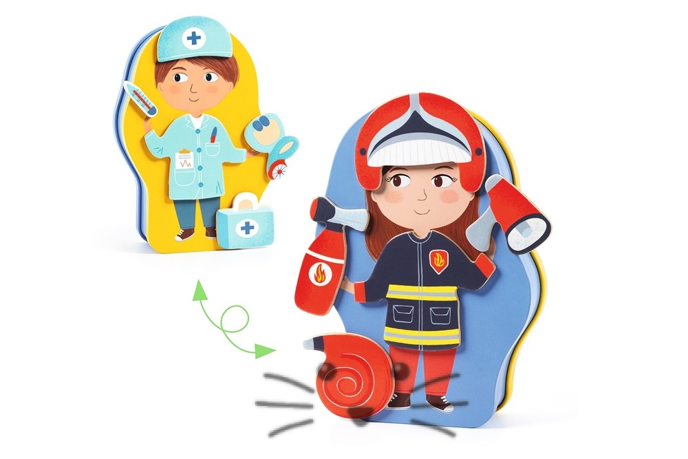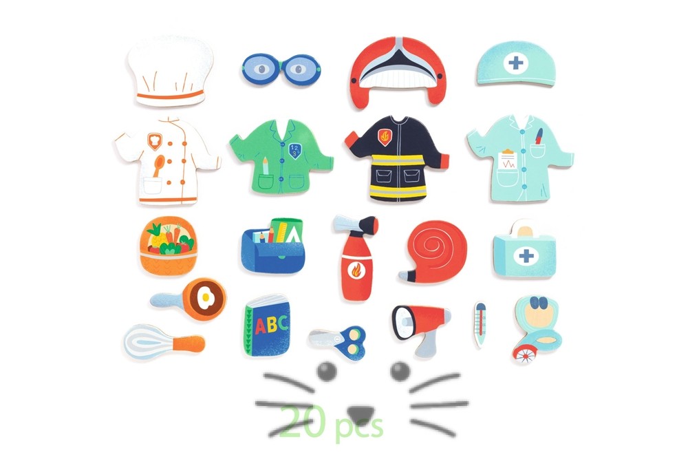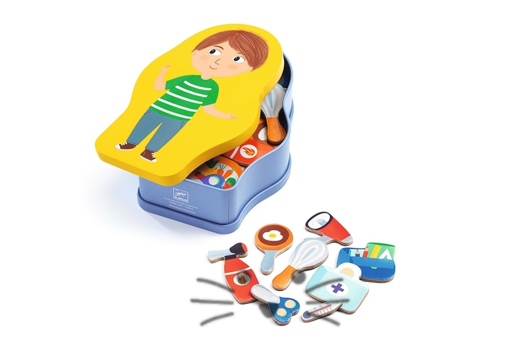 Una nueva forma de jugar con imanes. Los niños colocan piezas magnéticas de madera en una caja de metal para divertirse creando un bombero, un médico, un profesor, un cocinero y muchos otros personajes. Los dos lados de la caja están ilustrados para poder jugar en ambos: de un lado una niña y del otro un niño. Ideal para viajes. Edad Sugerida: a partir de 3 años en adelante