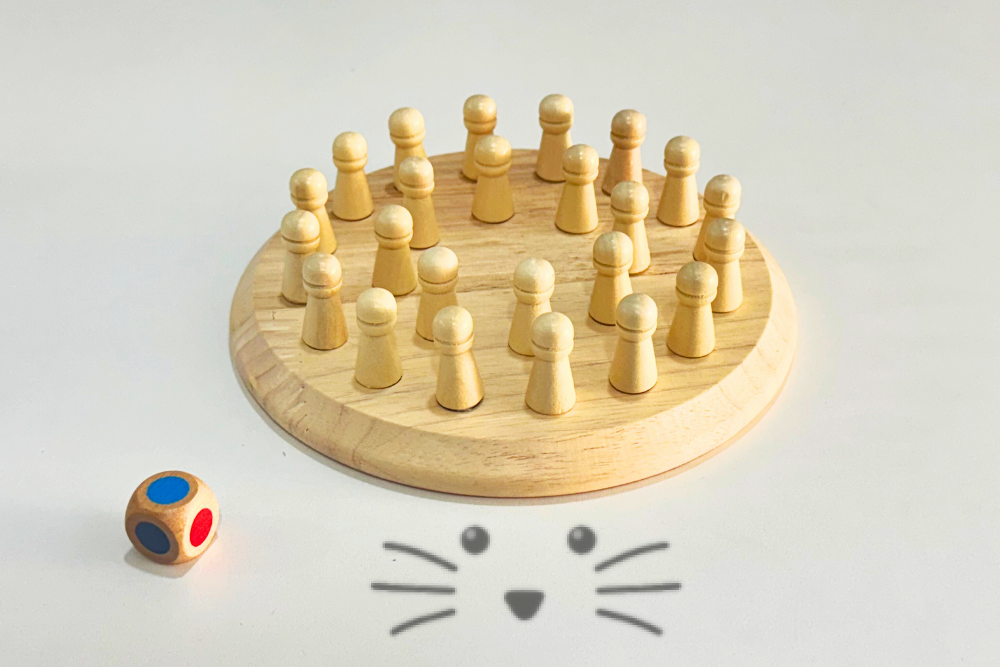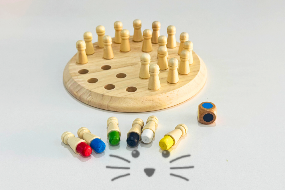 Inserta las clavijas de madera en el tablero al azar con colores ocultos. Hay diferentes formas de jugar el juego. Los jugadores tiran el dado por turnos y extraen un pin. El objetivo es obtener la mayor cantidad de pines. Parece fácil, pero no lo es tanto, porque al estar insertados los pines en el tablero, la parte coloreada queda oculta. Así, cada vez que alguien extrae un pin, puede acertar o no con el mismo color que ha salido en el dado. Si acierta, se quedará el pin y volverá a tirar el dado de nuevo. Si no, dejará el pin exactamente en el mismo sitio y le tocará el turno a otro jugador. Y es ahí donde interviene la memoria, porque todos los jugadores han visto de qué color era ese pin y deben intentar recordarlo para cuando les toque elegir. Por supuesto, la cosa se complica cuando debes intentar recordar el color del mayor número posible de pines para reducir al mínimo tus fallos. Te conviertes en el ganador de esta partida si se da una de estas tres circunstancias: Número de Piezas: Cuando ya no quedan más pines que extraer del tablero, el jugador que haya acumulado más piezas, gana la partida. Póker de Color: Si, en cualquier momento del juego, alguno de los jugadores se hace con los cuatro pines del mismo color, no será necesario continuar. Habrá ganado. Escalera De Color: ocurre cuando uno de los jugadores consigue reunir una pieza de cada uno de los seis colores que están representados en el juego. Campeón por acumulación. Edad Sugerida: a partir de 3 años.
