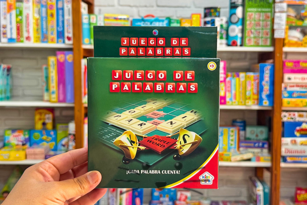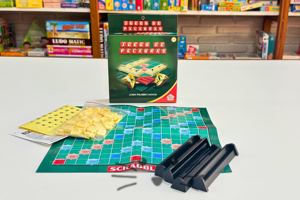 Juego de mesa en el que los jugadores forman palabras sobre un tablero de casillas, como en un crucigrama, para conseguir la mayor puntuación posible. Cada jugador roba siete fichas y se turna para construir palabras horizontales o verticales, conectándolas a las letras ya existentes. La puntuación se calcula sumando el valor de las letras, y puede aumentar con casillas especiales que multiplican el valor de las letras o de las palabras. Contiene: 100 fichas plásticas, letras autoadhesivas, 4 atriles de plástico y tablero de cartón. Edad sugerida: a partir de 6 años