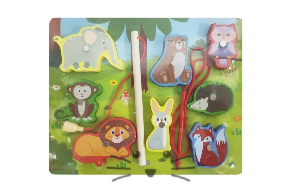 Figuras de animales de la selva con imanes para encastrar en la base usando la cañita. Mejora la coordinación mano-ojo, la motricidad y la imaginación. Medidas: 22 cm de largo x 18 cm de alto x 2 cm de ancho. Incluye una base, una caña de 15 cm y 8 figuras en relieve.
