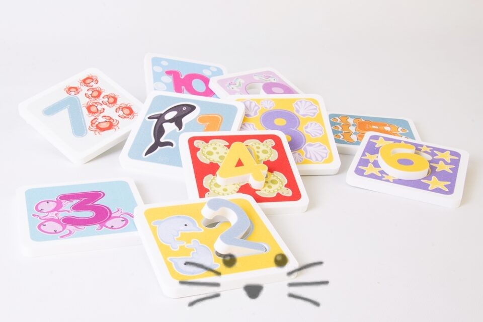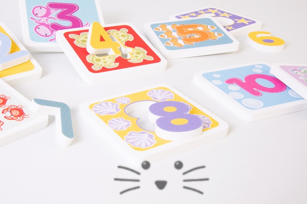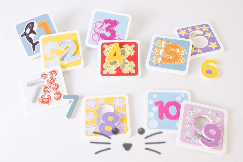 Fichas con números encastrables y personajes para relacionar. Consiste en piezas cuadradas con números encastrables, que les permitirá a los niños y niñas reconocer los números según la cantidad de personajes que hay en cada ficha. Contiene 10 fichas de 8 x 8 cm con números encastrables que van del 1 al 10. Material: goma eva de alta densidad de 6 mm de espesor.