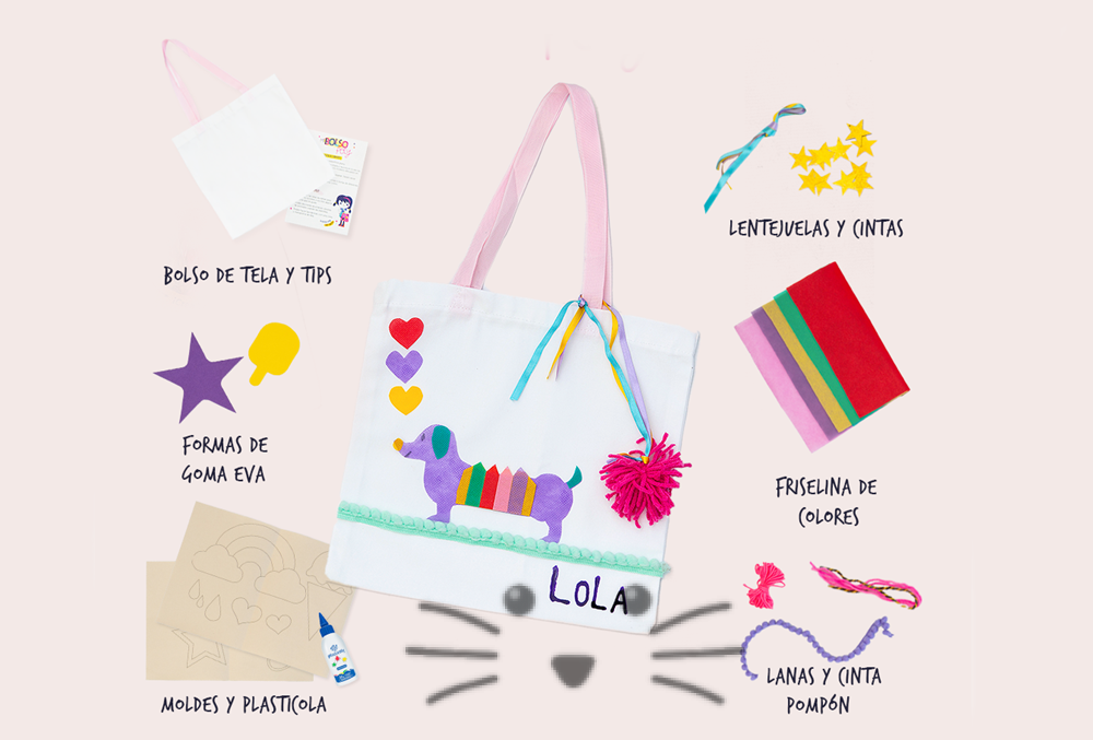Con este kit vas a poder crear y diseñar tu propio bolso, para llevarlo con vos a todos lados. Incluye: bolso de tela, telas de colores, lanas y cintas, pegamento, molde de borla y lana de color. Medidas Bolso: 30 cm alto x 30 cm de largo. Edad sugerida: a partir de 4 años en adelante.