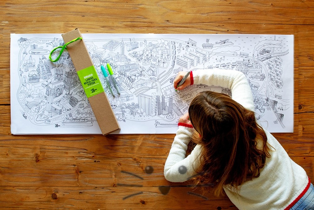 Enorme. Original. Enmarcable. Invita a la actividad compartida y regala muchas horas de juego. Al tener línea de horizonte, se puede colgar en la pared. Especial para pintar en familia, permite de dos a cuatro participantes simultáneos. Impresa en tinta negra sobre papel obra de 120 gramos. Medida desplegada: 41 x 118 cm. Se presenta en una bonita caja individual de 6,5 x 6,5 x 42 cm. Edad sugerida: a partir de 7 años en adelante.