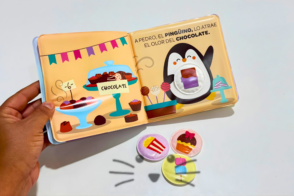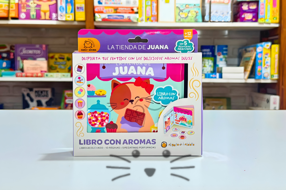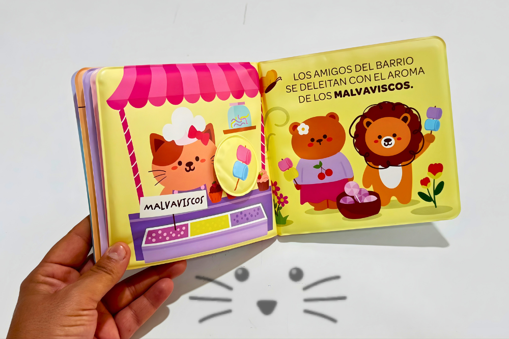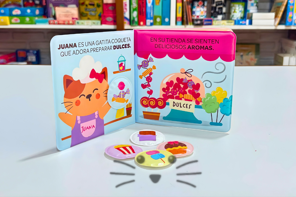 Este libro transforma la hora del baño en una experiencia multisensorial única, donde los chicos no solo miran y tocan… ¡también descubren aromas! Se trata de un libro interactivo con piezas removibles con velcro y aromas, que los chicos pueden manipular mientras crean su propia historia. En este caso, acompañamos a Juana, una gatita que prepara dulces… ¡y todo huele delicioso!