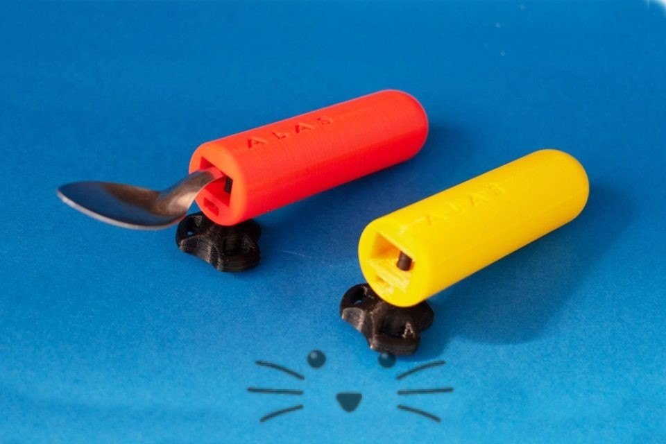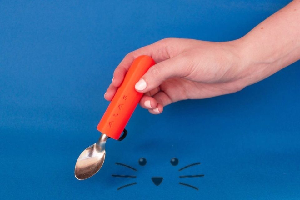 Mango ajustable a varios instrumentos. Ideal para actividades de alimentación o higiene. Pensado para niños ya que el agujero apertura está diseñado para cubiertos pequeños. Medidas: agujero de apertura 1,5 x 1 cm. Tiene 8 cm de profundidad. El largo total es de 9 cm y de ancho 2,5 cm. Material: impreso en 3D. Los colores varían según stock disponible.