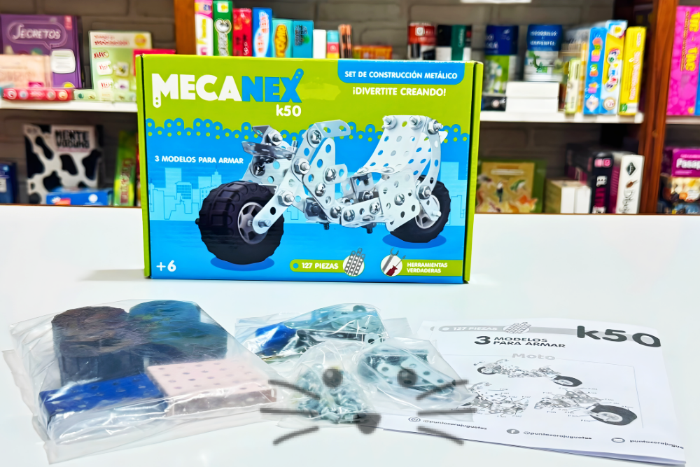 Modelos k50. Contiene 127 piezas y herramientas. Permite crear hasta 3 modelos diferentes (Moto chopera, Camión y Auto). Despierta el ingenio y estimula la creatividad. Edad Sugerida: a partir de 6 años en adelante.