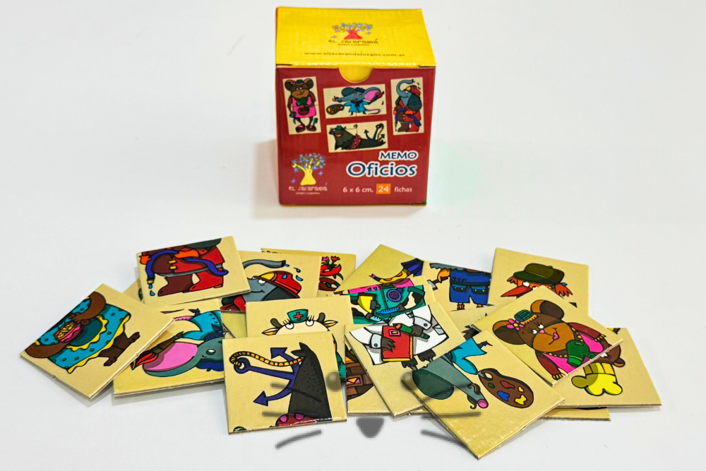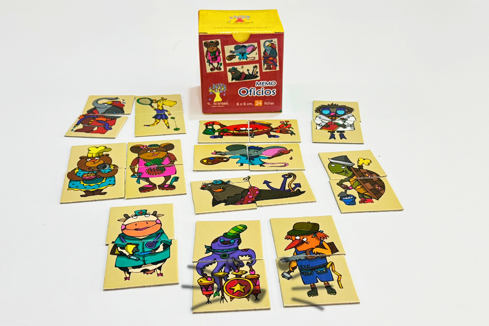 Memotest de animales y oficios. 12 pares para encontrar las coincidencias y armar el personaje. Contiene 24 fichas de cartón de alta resistencia. Si encontrás 2 personajes iguales te los quedás. Medidas Fichas: 6 x 6 cm. Cubo: 10 x 10 x 10 cm. Edad sugerida: a partir de 2 años.