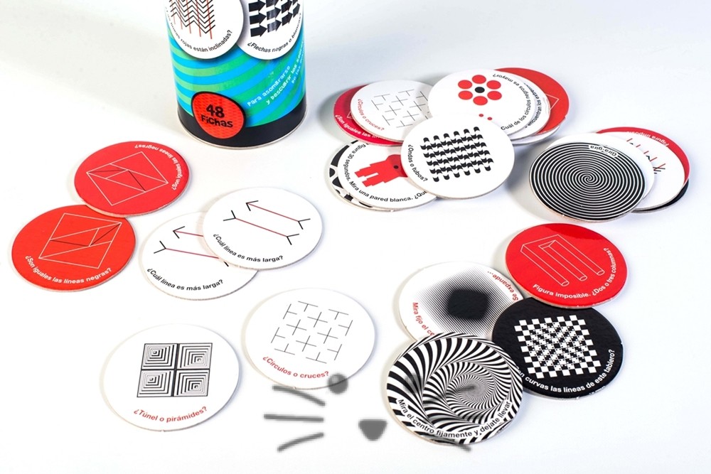 Consiste en 48 fichas para encontrar pares iguales, incluye regla para revelar y comprobar medidas, proporciones y colores y reglamento que explica cada efecto visual y por qué vemos lo que vemos. Medidas piezas: 6,5 cm de diámetro. Medidas Lata: 35 cm de alto x 8,5 cm de diámetro. Edad Sugerida: de 6 a 12 años.