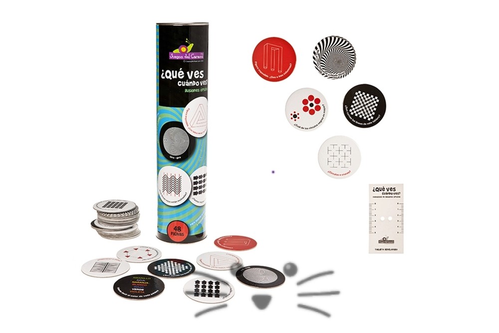 Un juego para asombrarse con los efectos de las ilusiones ópticas, jugar con la mirada y comprender lo que vemos. Líneas que se mueven, círculos que giran, tamaños que engañan, objetos imposibles, paralelas que se juntan. Para descubrir los secretos de imágenes tridimensionales, ilusiones de movimiento y profundidad, distorsiones de longitud, tamaño y percepción del color. Favorece la atención, la memoria y la agilidad visual.