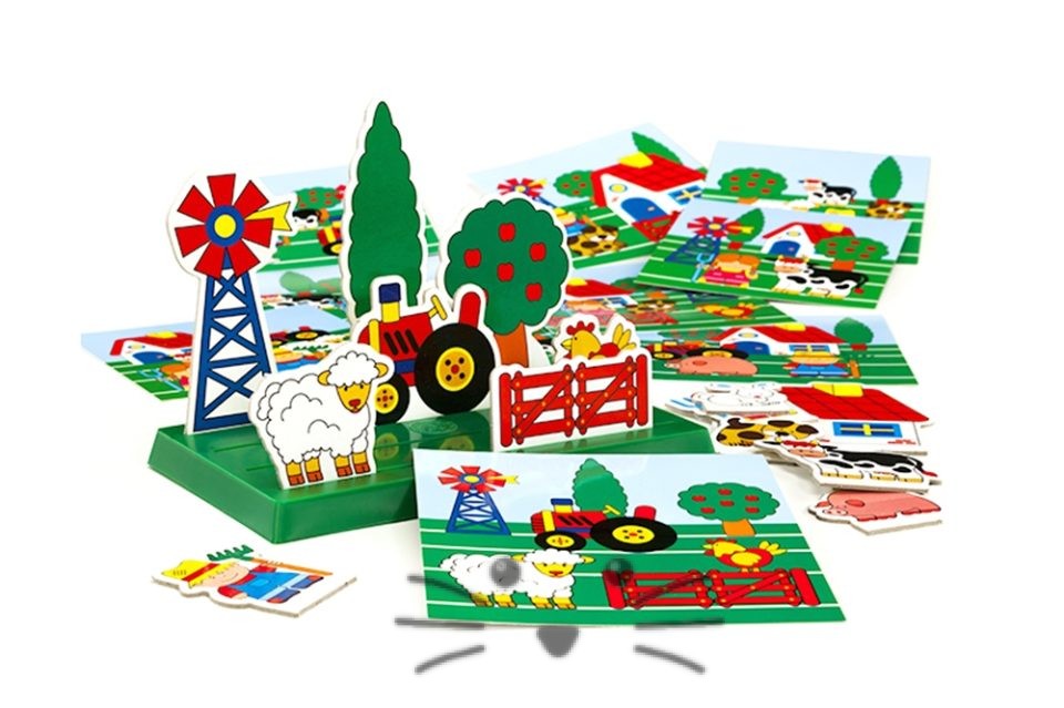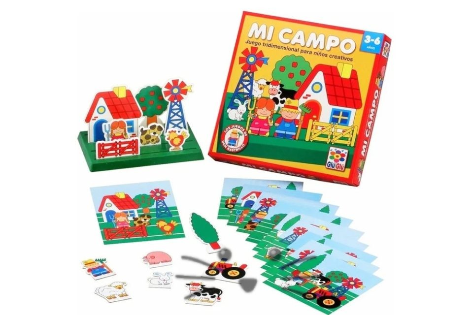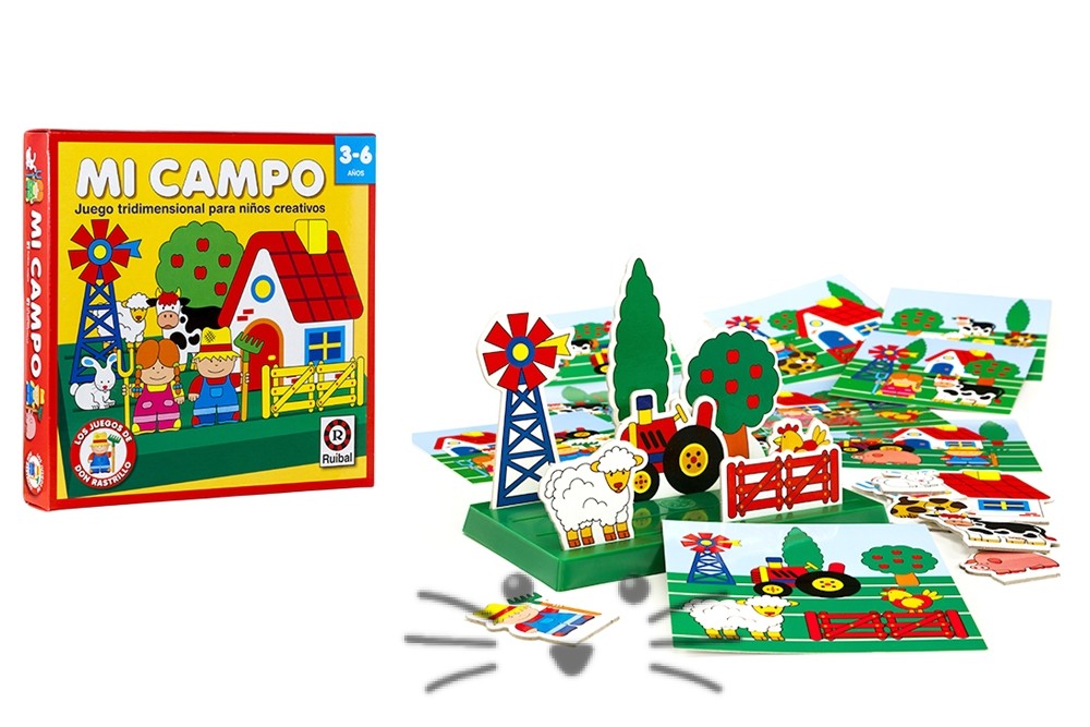 Un desafío para armar y desarmar escenas aprendiendo dónde pueden ubicarse las diferentes figuras. Mi campo es un juego tridimensional que facilita el aprendizaje de los términos cerca-lejos, adelante-atrás, izquierda-derecha. Las tarjetas ilustradas son guías para construir escenas de la vida del campo utilizando la base y las figuras troqueladas. Además, los chicos pueden crear nuevas escenas usando su propia imaginación. Contiene: 1 base plástica, 10 tarjetas con escenas campestres, 14 figuras troqueladas. Para uno o más jugadores a partir de 3 años.