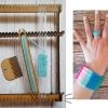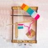 Kit para tejer. Incluye 2 bases largas, 2 bases ranuradas, Peine, Peineta separadora, Ovillo con lana, 3 medidas de Navetas y 3 medidas de agujas. Fabricado en MDF de 3 mm de espesor. Incluye lana para armar un brazalete.