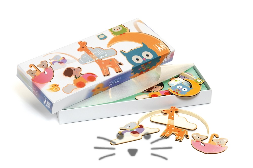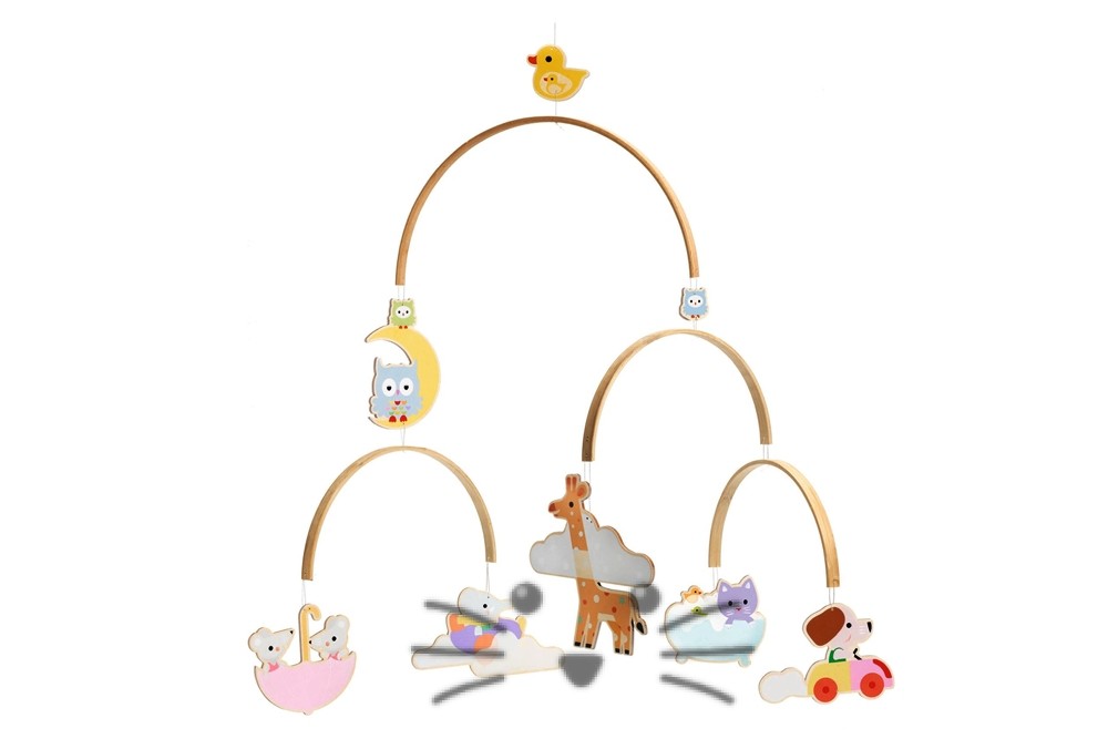 Un móvil de madera en colores suaves, perfecto para decorar la habitación del bebé. Al estar ya montado, basta con fijarlo para contemplar el balanceo de los animales en el aire. Un juego sutil de equilibrio entre sueño y realidad. Medidas: 60 x 52 cm