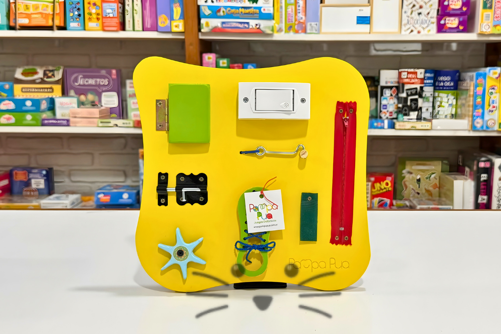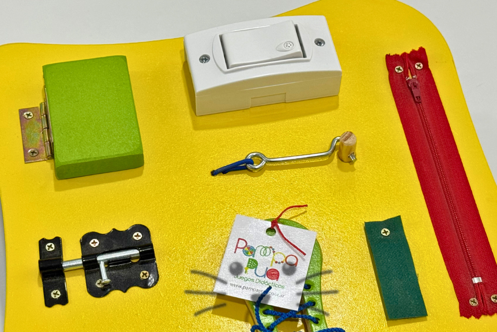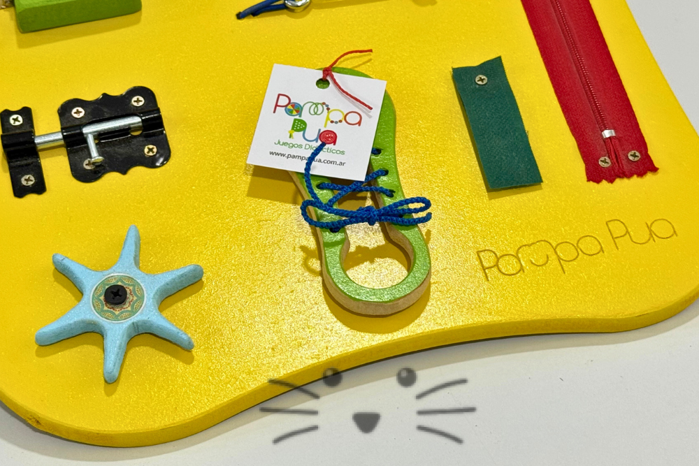 Panel de madera diseñado para que niños y niñas exploren y practiquen acciones de la vida diaria a través del juego. Incluye distintos mecanismos como cierres, pestillos, interruptor, picaporte, cremalleras y piezas giratorias, que invitan a la manipulación activa. Favorece el desarrollo de la motricidad fina, la coordinación ojo-mano, la concentración y la autonomía, respetando los principios del enfoque Montessori.